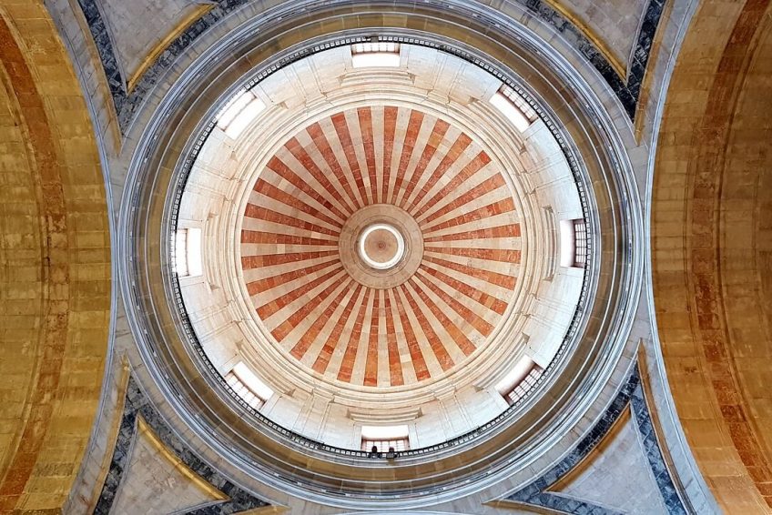 建筑是圆形的,在山墙下有一个巨大的花岗岩科林斯柱门廊(一层有8根,后面有两组4根)。长方形的前厅将门廊与圆形大厅连接起来,圆形大厅位于混凝土拱顶下,中央有一个通往天空的开口(oculus)。在万神殿建成近两千年后,它仍然是世界上最大的非钢筋混凝土圆顶。眼睛的高度和内圆的直径是一样的,142英尺(43米)