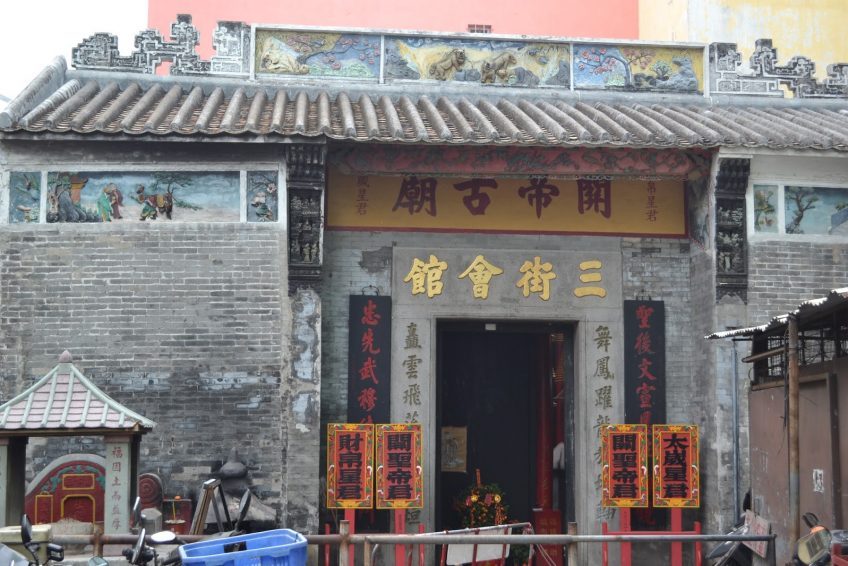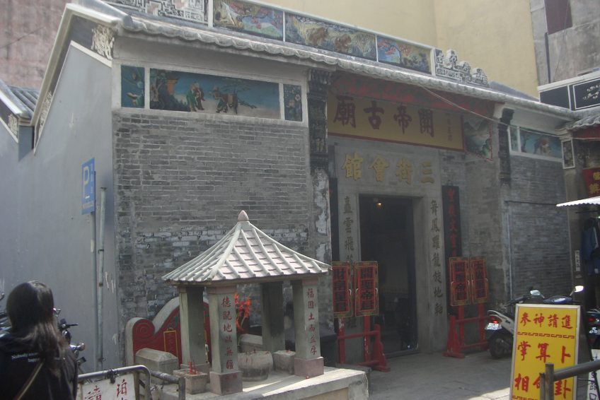 三街會館同時又稱“關帝廟”,這是因為會館中設有關帝神殿及財帛星君殿,以示崇敬,後因會館為公共場所,任人入內禱拜,祀者日眾,以致人們忘記它是一座會館,而直呼其為“關帝廟”。初始,公所與廟宇合一,後於第三次大修中將兩者分開,所謂“廟貌輝煌,旁設公所”,日久,三街會館權威喪失後,公所功能退化,而廟宇成為會館的主要功能。建築前豎立“關聖帝君”的高腳牌,然其門楣仍有“三街會館”四字。三街會館之所在地原為昔日澳門之繁榮市區“榮寧坊”,故其門前之社壇現仍刻有榮寧社字樣,且有聯雲“榮居康樂境,寧享太平年”。