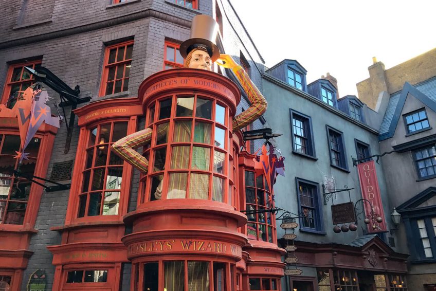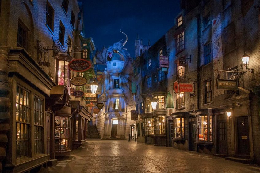 2014年7月8日,哈利波特魔法世界主题乐园新建的“斜角巷”(Diagon Alley)正式开张。斜角巷重现《哈利波特》小说和电影里的伦敦魔法界商业区。新添的斜角巷最大的卖点 是“逃出古灵阁”飞车,还有各种餐馆和纪念品店。霍格华兹和斜角巷分别设在环球影城游乐园的不同园区,拥有两个乐园的通行证的宾客可搭乘霍格华兹快车往来两地。