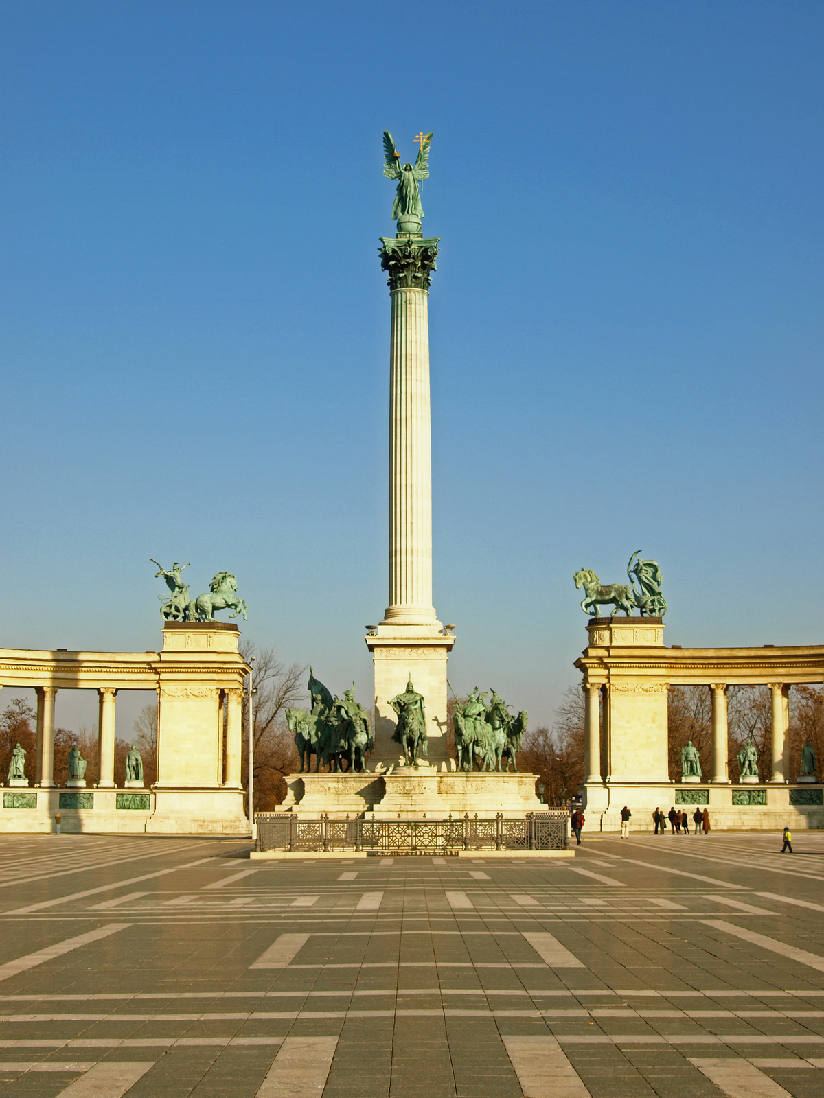 千年纪念碑的核心是凯旋柱,高出英雄广场上方三十六米(118英尺)的高度。在柱子的顶部有一个天使长加布里埃尔的雕像,右手拿着一顶王冠。根据传说,大天使在梦中出现在圣斯蒂芬,并为他提供了匈牙利的王冠。在基地,柱子周围是七个凶猛的勇士的马术雕像。这些雕像描绘了由Árpád王子领导的马扎尔酋长,他们在现在被称为匈牙利的地区定居。