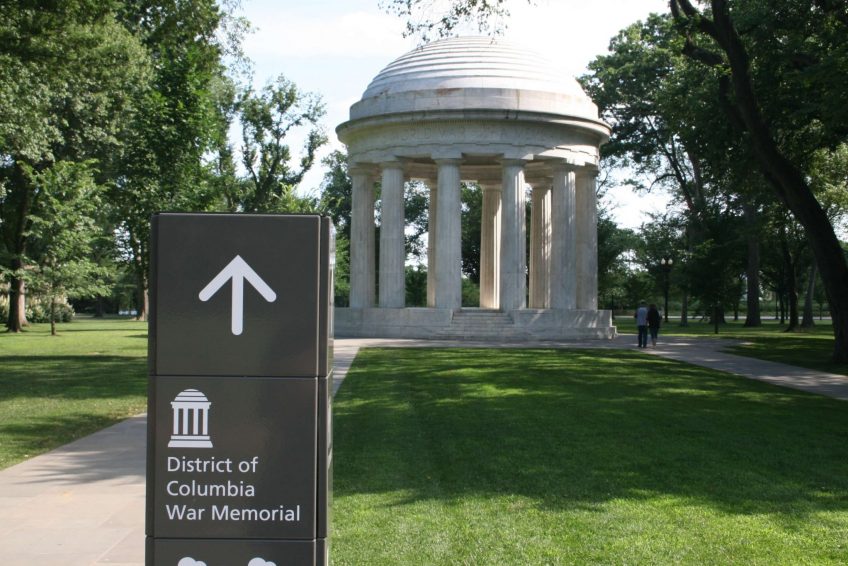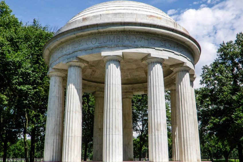 由华盛顿建筑师弗雷德里克·h·布鲁克(Frederick H. Brooke)和贺拉斯·w·皮斯利(Horace W. Peaslee)以及内森·c·威斯(Nathan C. Wyeth)共同设计的哥伦比亚战争纪念区(the District of Columbia War Memorial)是一座高47英尺(14.3米)的圆形圆顶多里奇神庙(Doric temple)。在混凝土地基上,4英尺(1.2米)高的大理石底座为一个平台,其直径为43英尺5英寸(13.2米),用作绷带支架。保存在哥伦比亚特区战争纪念馆的基石上的是一份26000名在大战争中服役的华盛顿人的名单。基地上刻着哥伦比亚特区499名在战争中丧生的市民的名字,以及代表军队各部门的徽章。12个22英尺(6.7米)高的有凹槽的多利克大理石柱支撑着上穹和圆顶。