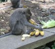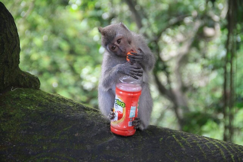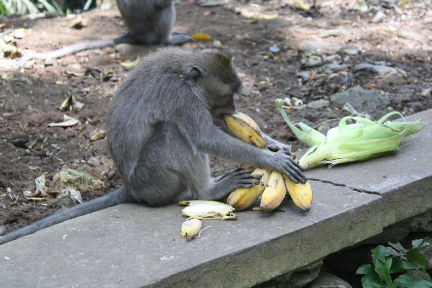 狗——否则可能会吓到猴子——是不允许进入乌布猴森林的,猴子已经不再害怕人类了。一般来说,它们不会接近那些它们认为不会提供食物的人类,但它们总是成群结队地接近人类访客,并抓起任何装有人类食物的袋子。他们也可能抓着不含食物的塑料瓶和袋子,也可能把手伸进游客的袋子和裤袋里寻找食物,甚至爬上游客的手去拿食物,即使食物是举过游客头顶的。游客会注意到许多肥胖猴子的有趣现象,这证明了大量游客进入森林所提供的食物几乎是无限的