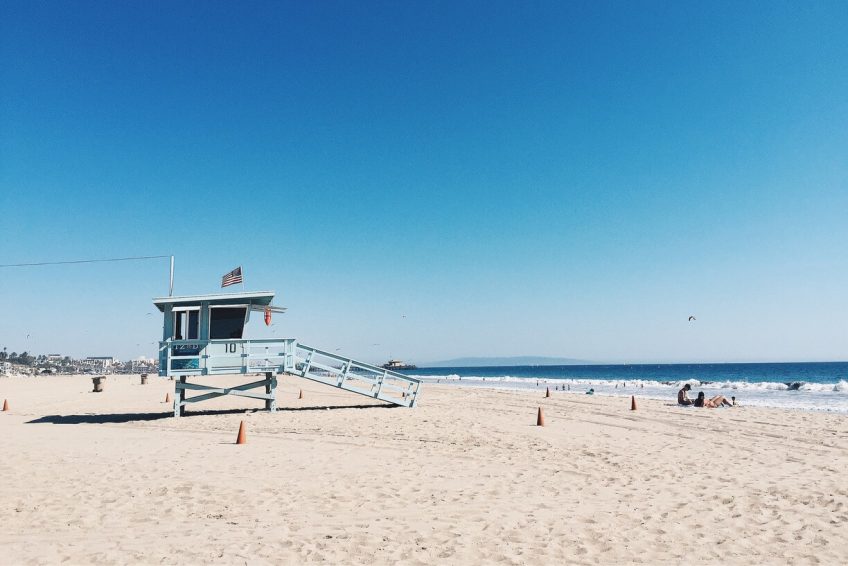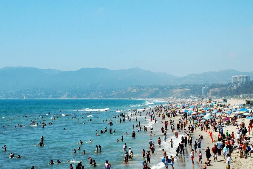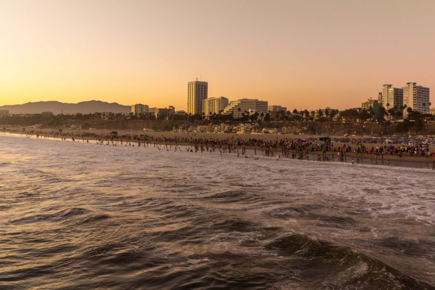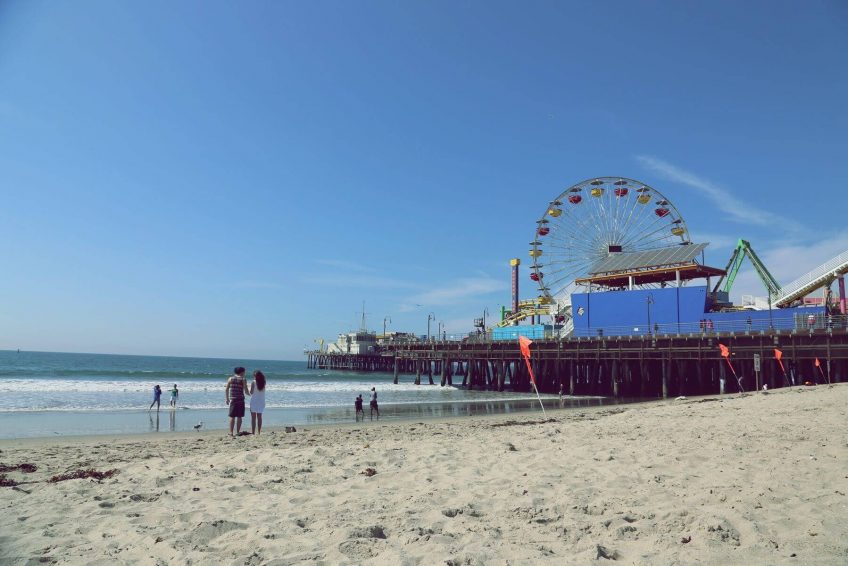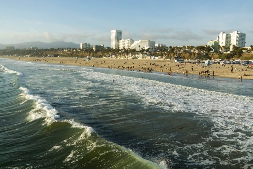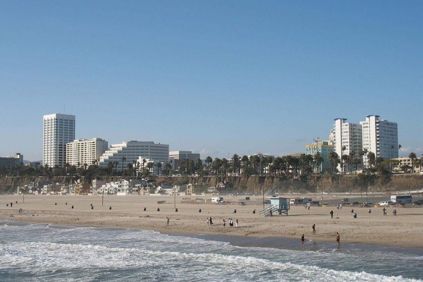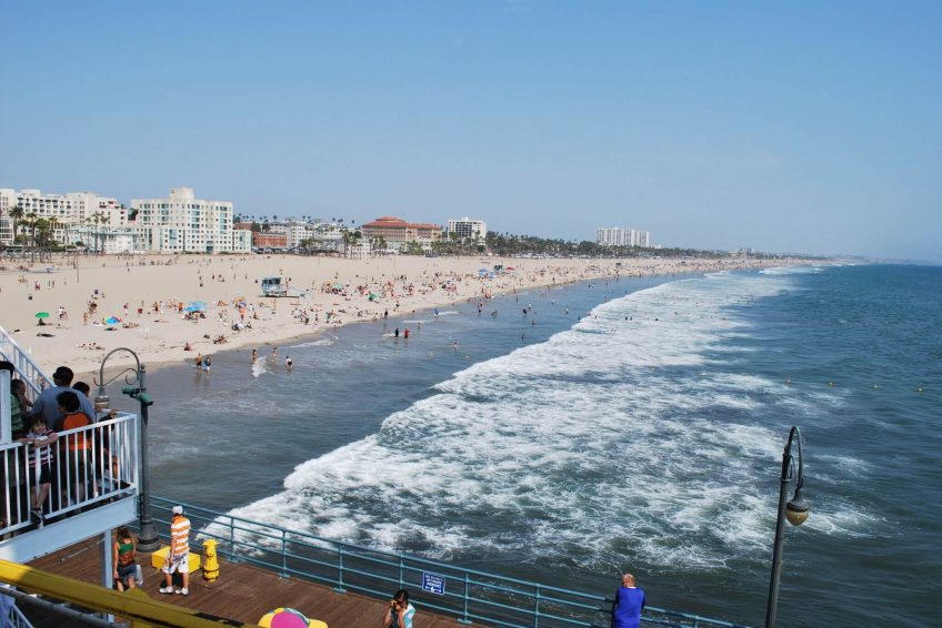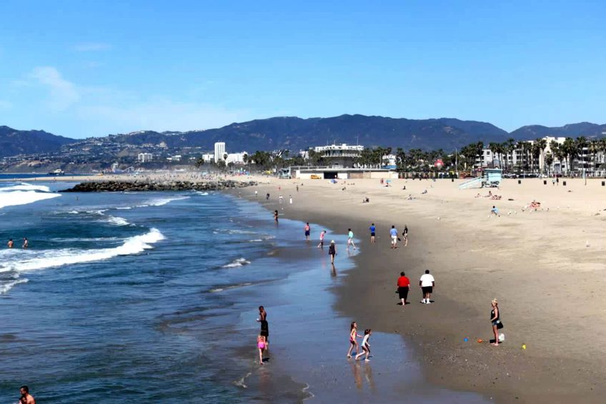 圣莫尼卡海滩沿着太平洋海岸公路,两英里长,有野餐区,商店,和码头, 以及救生员站,休闲餐馆,设备租赁点,健身活动设施,自行车道,木质小径,供在温暖的日子前往沙滩。 游客活动包括排球,篮球和跑道。