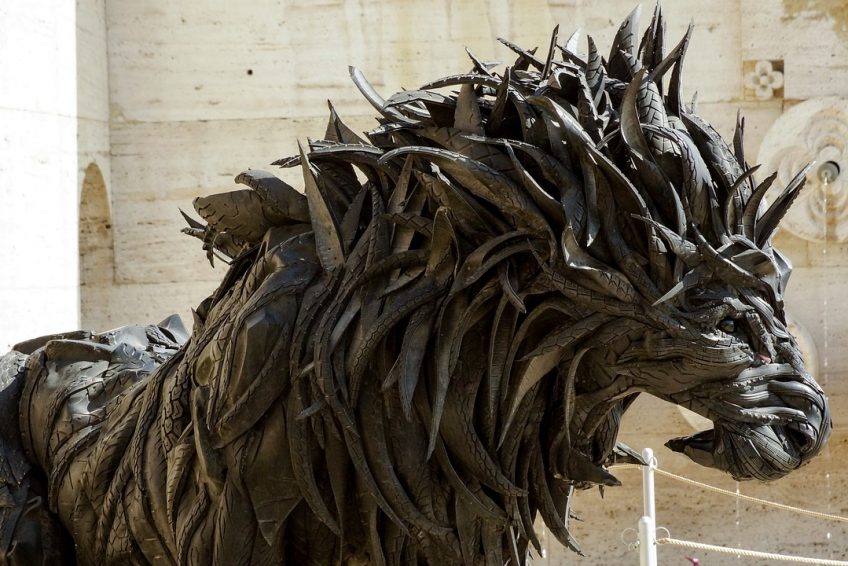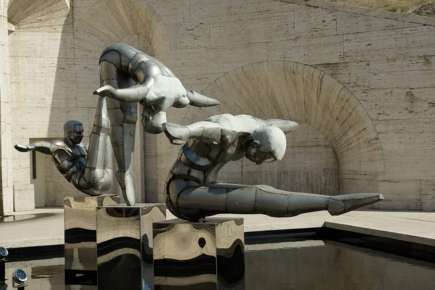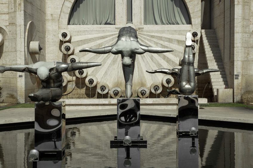 瀑布的外部有多个层次,装饰有喷泉和来自Cafesjian收藏的现代主义雕塑。楼梯可以让行人一览无垠地看到埃里温中心和阿拉特山的景色。在瀑布的底部是一个花园庭院,里面有当代雕塑作品,如博特罗(Botero)。