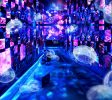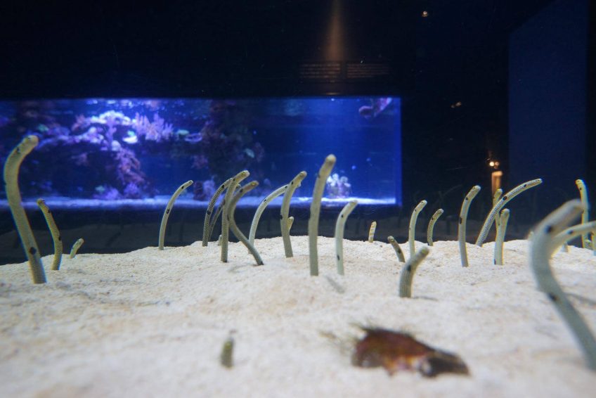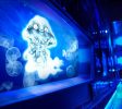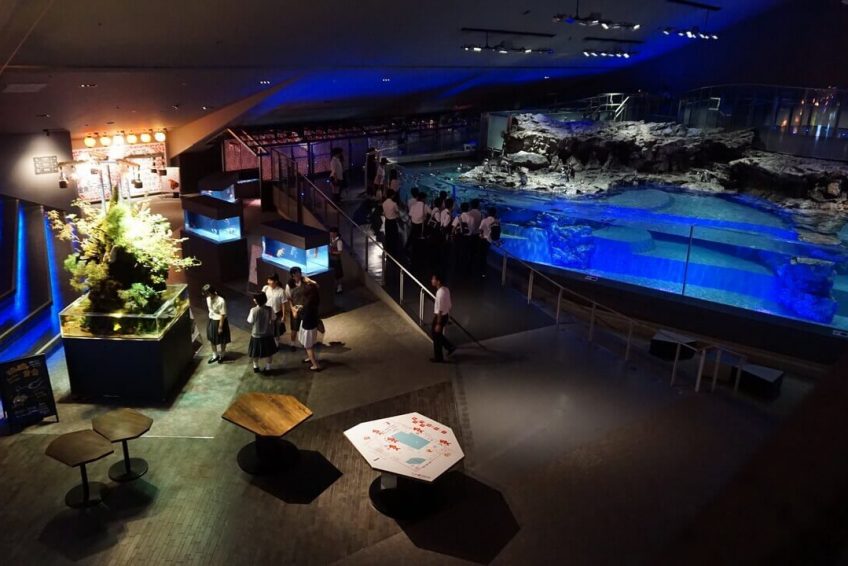 在水母区域(水母展示水槽)上,可以与led灯一起展示水水母、章鱼水母等。接着,“labo”解说到了水母成为成体的各个阶段。2015年1月举行的“水母万花镜隧道”(全长50米的坡区,在墙壁和天花板5000多张镜子)中,以水母为主题的影像、照明、音乐、aroma进行空间演出。
