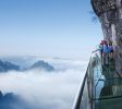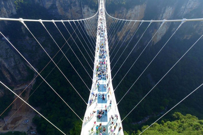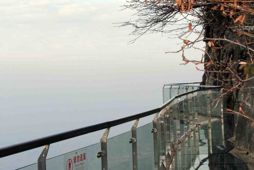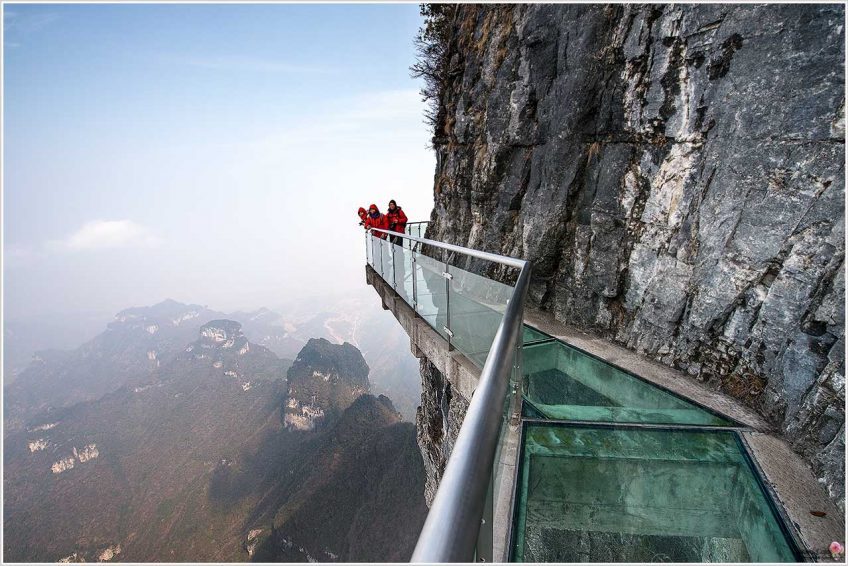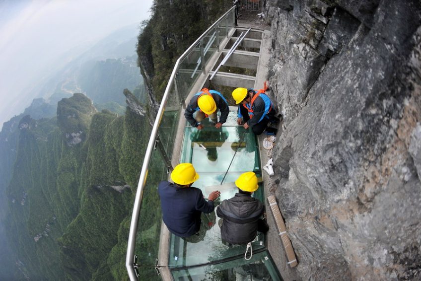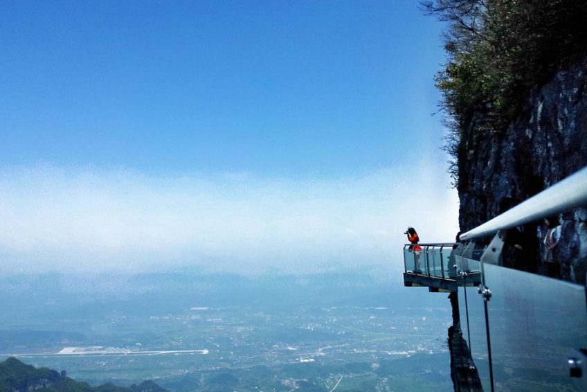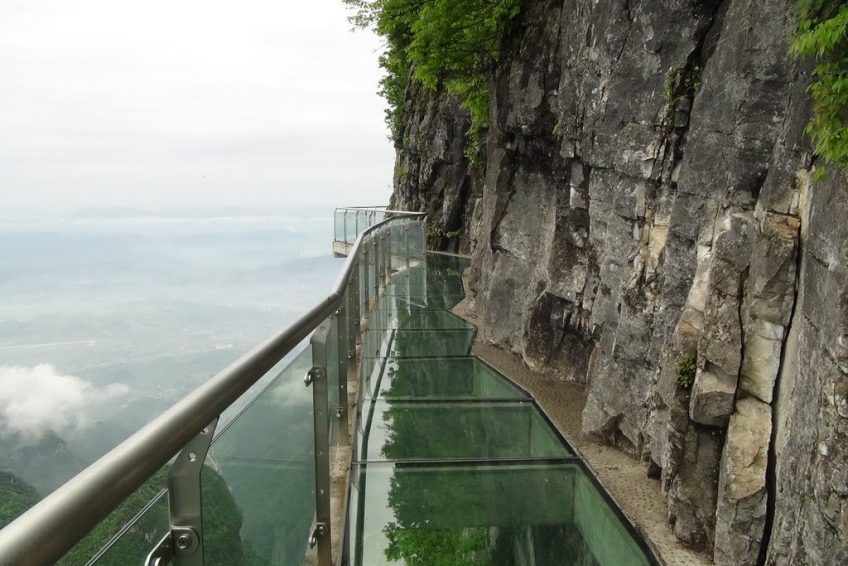 張家界的天門山是一個著名的風景名勝區,有很多人吸引著體驗玻璃板的驚人魅力。然而,中國最長,最寬,最高海拔的玻璃棧橋是保定白石山的玻璃棧橋。