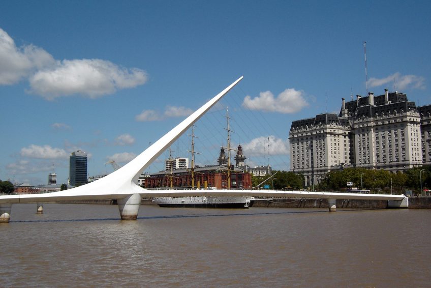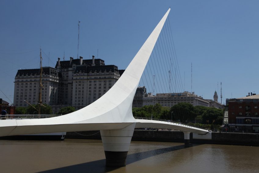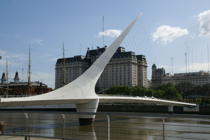 这座桥代表了一对情侣舞蹈探戈,白色桅杆象征着男人和桥梁的曲线,女人。它有一个大的转动机构,允许它打开,允许帆船通过。这座桥在西班牙建造,并通过私人捐赠捐赠给布宜诺斯艾利斯。