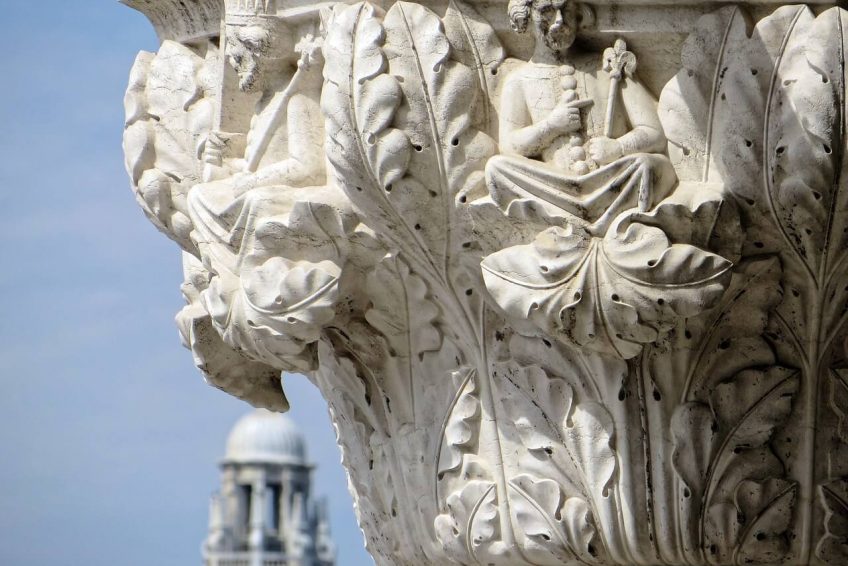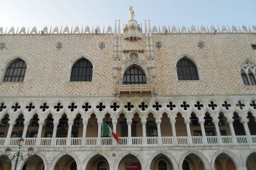 公元810年,Doge Agnello Participazio把政府所在地從Malamocco島移至如今的里阿爾托(Rialto)地區,決定建造一座“公爵宮”(palatium duci,拉丁語,“公爵宮”)。然而,這座9世紀的建築在10世紀的一場大火中被部分燒毀。下面的重建工作是在Doge Sebastiano Ziani(1172-1178)的要求下進行的。作為一個偉大的改革家,他將徹底改變整個聖馬可廣場的佈局。新宮殿是用堡壘建造的,一個正面是廣場,另一個是俯瞰聖馬可盆地。雖然那座宮殿的遺跡已經所剩無幾,但在一樓仍然可以看到一些拜占庭-威尼斯建築的特色,牆底是伊斯特里安石砌成的,還有一些人字形的磚砌。