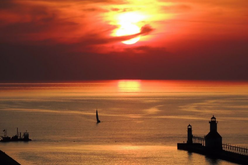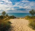 密歇根湖有很多海滩。该地区通常被称为美国的“第三海岸”,仅次于大西洋和太平洋。这种沙子通常是柔软的,呈灰白色,被称为“唱歌的沙子”,因为当它行走时发出的吱吱声(由高石英含量引起)。一些海滩沙丘覆盖着绿色的草和沙海滩樱桃,和水通常是清晰和冷静,55至80°F(13 – 27°C),即使在夏季末。然而,由于盛行的西风倾向于将地表水移向东部,所以夏季有一股暖流流向密歇根海岸
