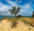 位于密歇根湖东岸的沙丘是世界上最大的淡水沙丘系统。事实上,沿着海岸线的多个地方,沙丘高出湖面几百英尺。沿着印第安纳州和密歇根州海岸线的许多州立公园、国家森林公园和国家公园都可以看到大沙丘的形成。印第安纳沙丘国家湖滨公园、索格塔克沙丘州立公园、沃伦沙丘州立公园、霍夫马斯特州立公园、银湖州立公园、卢丁顿州立公园和休眠熊沙丘国家湖滨公园都是最广阔和独特的沙丘形态。在伊利诺斯州海滩州立公园的密歇根湖西海岸发现了小型沙丘,而在威斯康星州的Kohler-Andrae州立公园和Point Beach州立森林发现了中等大小的沙丘。在门半岛的威斯康辛州白鱼沙丘州立公园,可以发现一个大型沙丘群。密歇根北部的密歇根湖海滩是世界上唯一的地方,除了该地区的一些内陆湖泊,在那里你可以找到Petoskey石头,即州立石