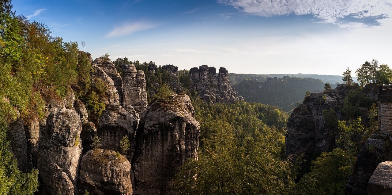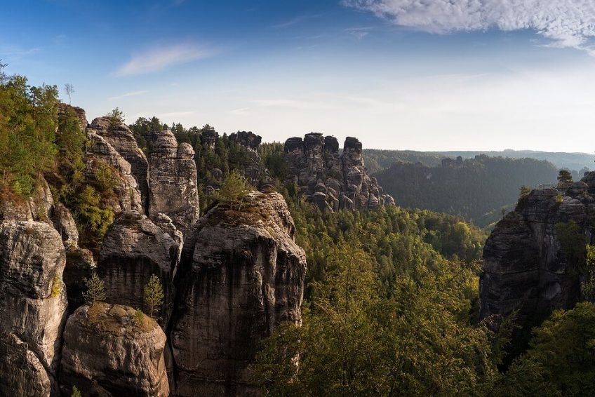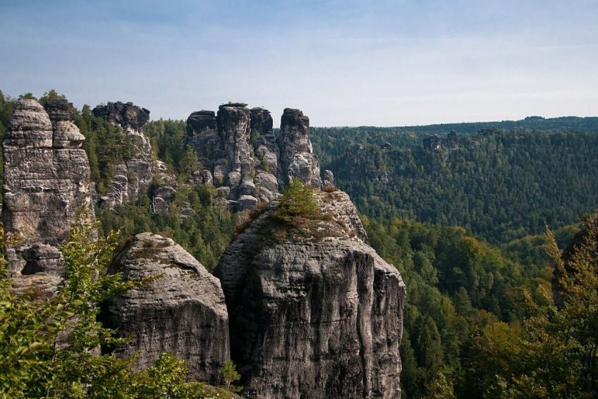 Bastei是位于德国易北砂岩山区的易北河194米高的岩层。巴斯蒂河的锯齿状岩石海拔305米,是一百多万年前水蚀形成的。它们坐落在拉森附近,离德累斯顿东南的皮纳不远,是撒克逊人瑞士国家公园的主要地标。它们也是延伸到瑞士(捷克共和国)边境的登山和徒步旅行区域的一部分。