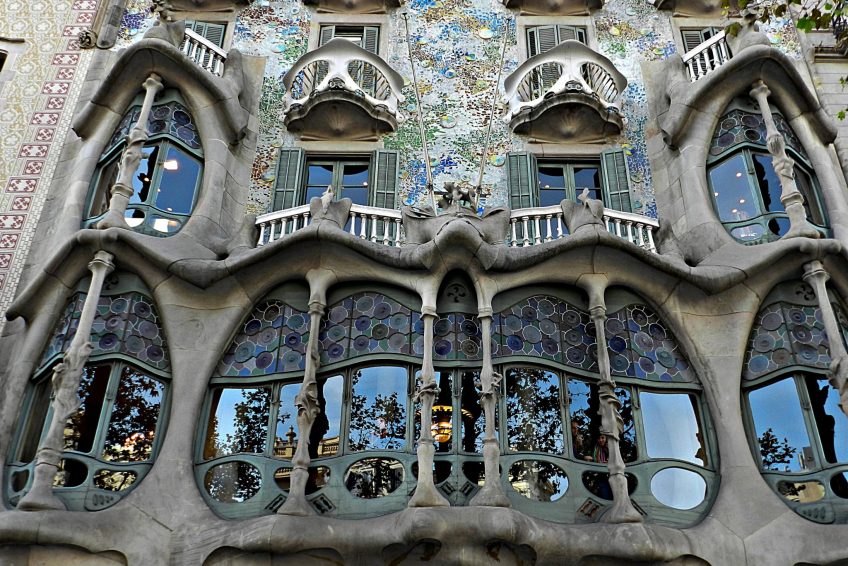 從外部看來,Casa Batlló(巴特洛公寓)看似是由顱骨和骨骼搭建的。實際上,“顱骨”代表陽台,“骨骼”指的是支承柱。