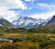 库克山是新西兰最高的山。自2014年以来,它的高度为3724米(12218英尺),比1991年12月之前的3764米(12349英尺)有所下降,原因是一场岩崩和随后的侵蚀。它位于南阿尔卑斯山,这条山脉贯穿南岛。这是一个很受欢迎的旅游目的地,也是登山者最喜欢的挑战。主动脉弓/库克山由三个峰组成,从南到北为低峰(3593米或11788英尺)、中峰(3717米或12195英尺)和高峰。峰顶位于南阿尔卑斯山脉主分水岭的偏南和偏东,东部是塔斯曼冰川,西南部是胡克冰川