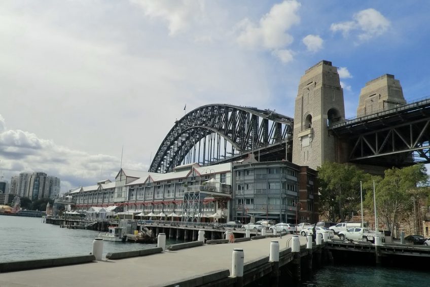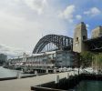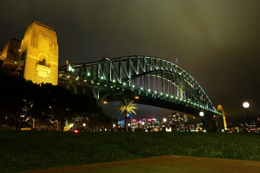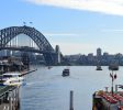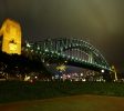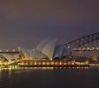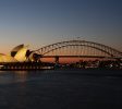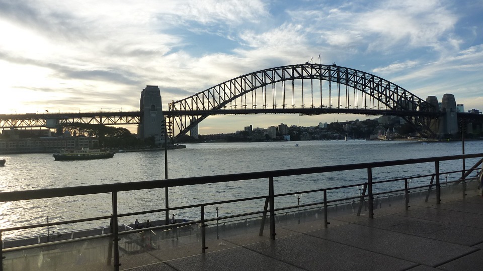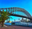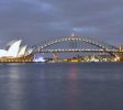 悉尼海港大橋,鋼拱大橋橫跨悉尼港(傑克遜港),澳大利亞。該橋於1932年開通,是悉尼及其港口北側郊區之間的主要交通樞紐。它橫跨約500米(1,650英尺),使其成為世界上最長的鋼拱橋之一。沿著它的長度,它有四條鐵軌,一條高速公路和兩條人行道。