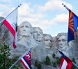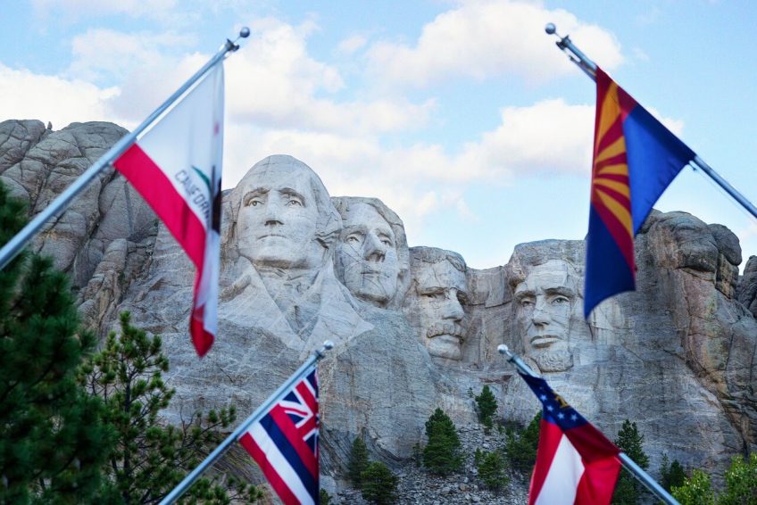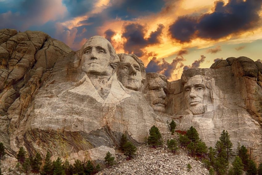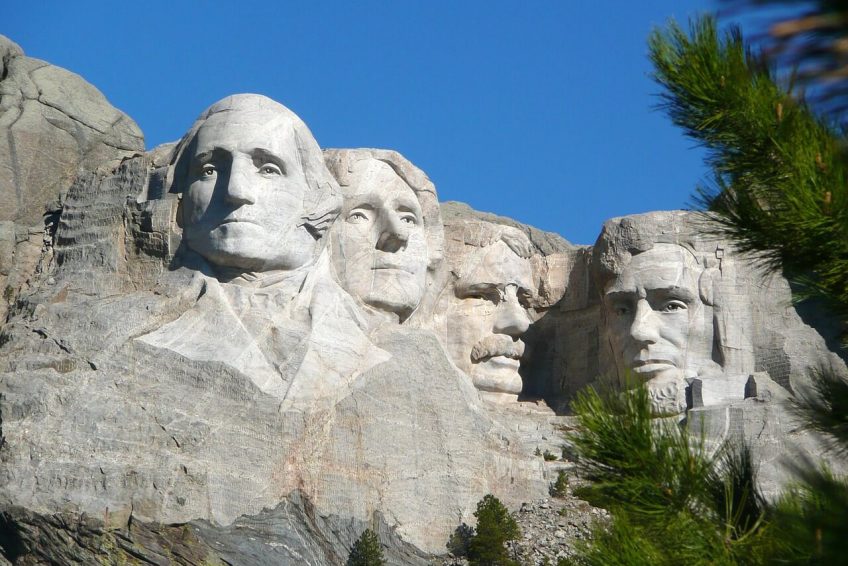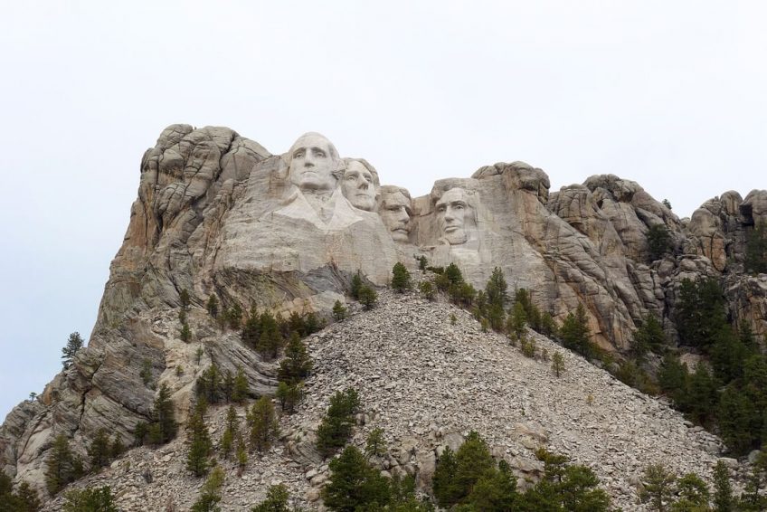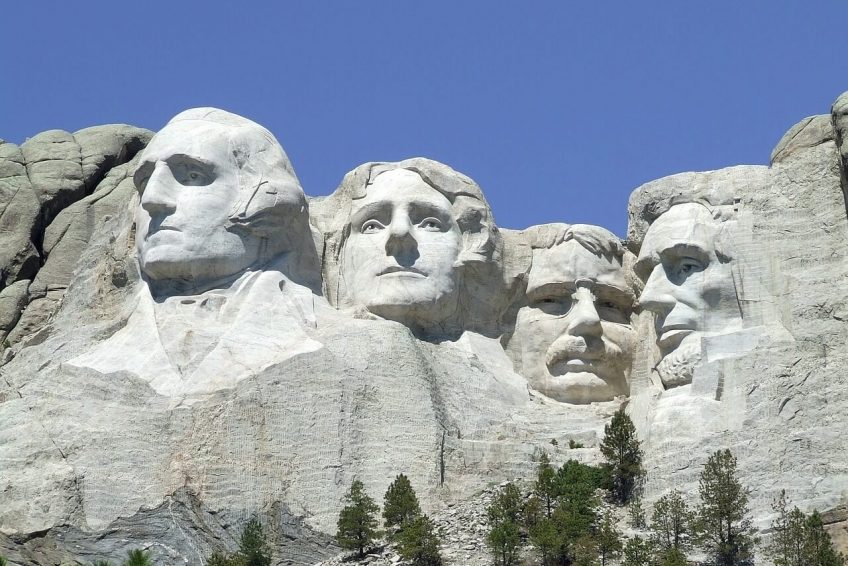 在南達科塔州基斯通的布萊克山,拉什莫爾山國家紀念碑的中心是雕刻在拉什莫爾山花崗岩表面的雕像。雕塑家Gutzon Borglum在他的兒子Lincoln Borglum的幫助下,完成了雕塑的設計,並在1927年至1941年間監督了這個項目的執行。這些雕塑以60英尺(18米)高的美國總統喬治·華盛頓(1732-1799)、托馬斯·杰弗遜(1743-1826)、西奧多·羅斯福(1858-1919)和亞伯拉罕·林肯(1809-1865)的頭像為特色。紀念公園佔地1278.45英畝(2.00平方英里;海平面以上5725英尺(1745米)