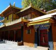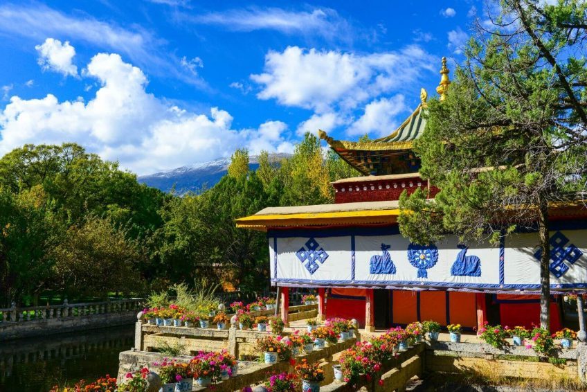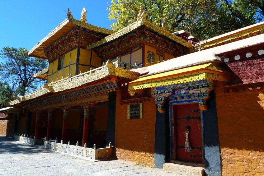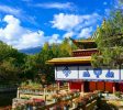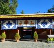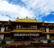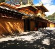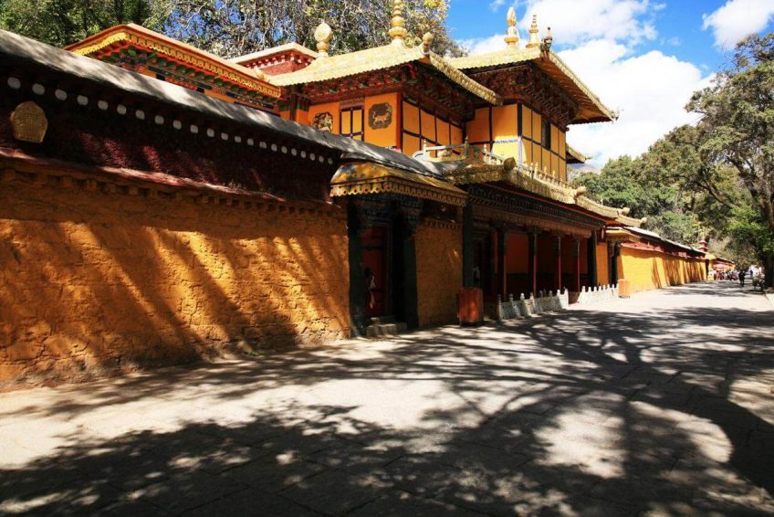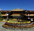 罗布林卡,意为宝贝园林,是历代达赖喇嘛夏季办公的夏宫,存有大量的遗迹和珍宝。园内有三百多间房屋,是西藏历史上规模最大,也是建筑最为精美的一处园林。罗布林卡环境优美,植物、花卉种类和数量都很多,树荫蔽日,好像拉萨的“世外桃源”。罗布林卡长度约有1公里,宽500米左右,步行游览即可。园内共分为三个区域,分别为东边入口阁楼的前园区,中部的核心宫殿区和西部以植物丛林为主的金色林卡区。前园区 园内的树木很密集,共有100多种植物,其中还有取自西藏各地甚至内地和国外的名贵花卉,被称为“高原植物园”。一走进园区便有浓密高大的树木出现在眼前,掩盖了内部的建筑,只有脚下的宽阔石板路引领人们向前。由于游人不多,使得园内有难得的静谧之感,阳光穿过浓密树叶漏洒在石板上非常安静,周围两侧的花朵多种多样又色彩斑斓,景色在拉萨十分难得。