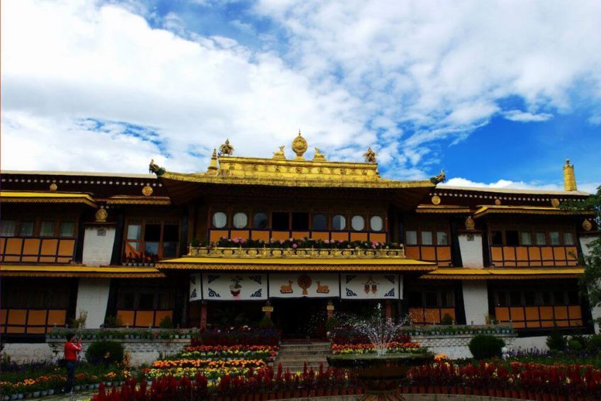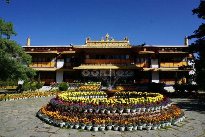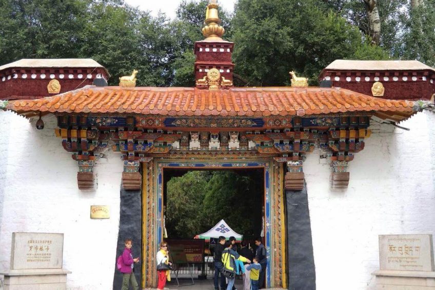 羅布林卡,意為寶貝園林,是歷代達賴喇嘛夏季辦公的夏宮,存有大量的遺跡和珍寶。園內有三百多間房屋,是西藏歷史上規模最大,也是建築最為精美的一處園林。羅布林卡環境優美,植物、花卉種類和數量都很多,樹蔭蔽日,好像拉薩的“世外桃源”。羅布林卡長度約有1公里,寬500米左右,步行遊覽即可。園內共分為三個區域,分別為東邊入口閣樓的前園區,中部的核心宮殿區和西部以植物叢林為主的金色林卡區。前園區 園內的樹木很密集,共有100多種植物,其中還有取自西藏各地甚至內地和國外的名貴花卉,被稱為“高原植物園”。一走進園區便有濃密高大的樹木出現在眼前,掩蓋了內部的建築,只有腳下的寬闊石板路引領人們向前。由於遊人不多,使得園內有難得的靜謐之感,陽光穿過濃密樹葉漏灑在石板上非常安靜,周圍兩側的花朵多種多樣又色彩斑斕,景色在拉薩十分難得。