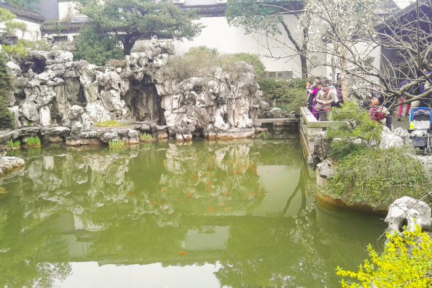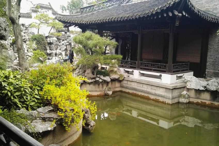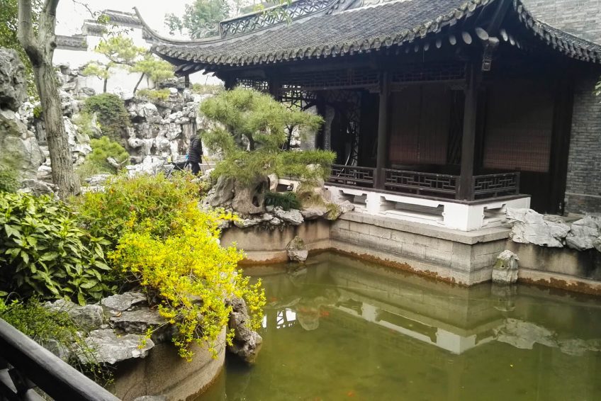 後花園從佈局上分為東、西兩個部分,主要建築有船廳、水心亭等。東部,以“廳堂”為中心構成一組院落,其中“船廳”最為精緻,廳型似船形,四周用鵝卵石、瓦片鋪地,花紋是水波狀,給人以水中而居的感覺。花園的西部,中間有一個水池,水池中建有水心亭,是園內主人觀看戲劇表演的地方,“水中戲亭”的設計獨具匠心。