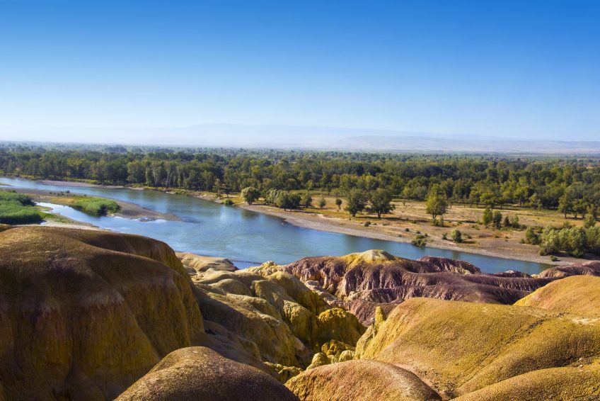 多色灣的南岸和北岸有不同的景色。在南岸,有山脈,綠洲,還有沙漠。您可以享受Kanzak人的原始游牧生活。曾經綠色的綠洲裝飾著五顏六色的野花,一群奶牛和綿羊想知道,馬匹奔跑,還有休閒的駱駝,這種自然風光與活潑的動物一起欣賞到令人愉悅的景色。
