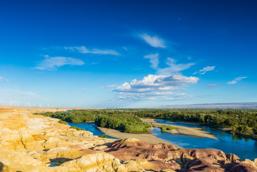 多彩多姿的海灘靠近喀納斯湖的保護區。在去中國的路上也可以看到中國最大的風電場。