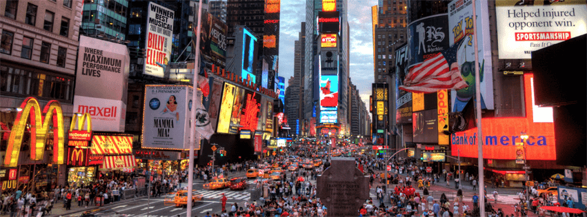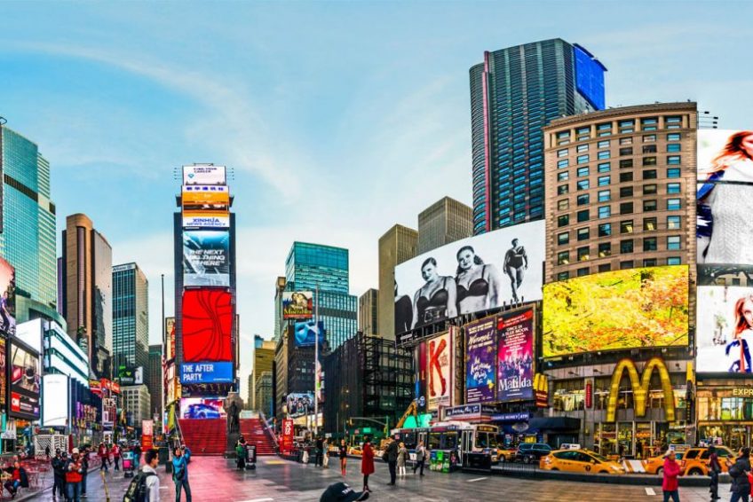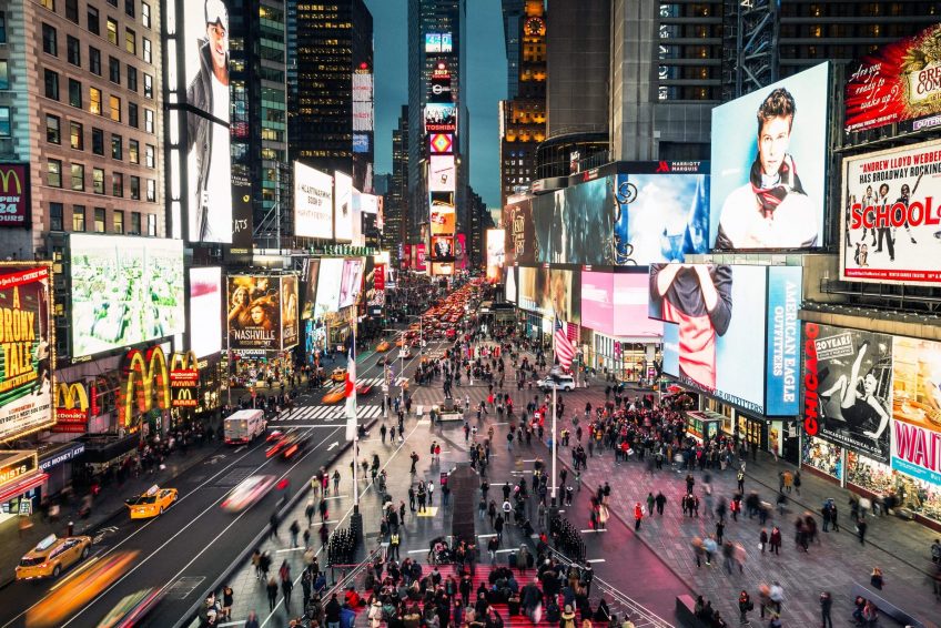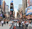 百老汇上的剧院、大量耀眼的霓虹光管广告、以及电视式的宣传版,已经深入成为象征纽约的标志,反映曼哈顿强烈的都市特性。时报广场是市内唯一在规划法令内,要求业主“必须”悬挂亮眼宣传版的地区。时报广场宣传版的密度,与拉斯维加斯可相比拟。