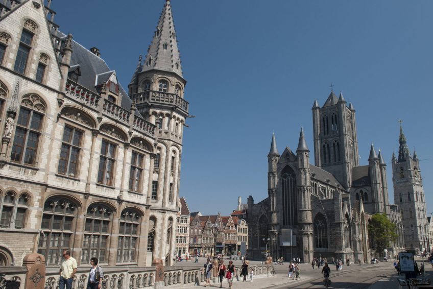 聖尼古拉斯教堂是根特最古老,最著名的地標之一。在13世紀初開始作為早期羅馬式教堂的替代品,在本世紀剩餘的斯海爾德哥特式風格(以附近河流命名)的建築中繼續建造。典型的風格是使用圖爾奈地區的藍灰色石頭,交叉口上方的單個大型塔樓以及建築物角落處的細長砲塔。