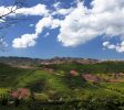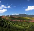 以巨大的绿茶农田为背景,花朵显得更加明亮,就像一条巨大的粉红色缎带在山上蜿蜒曲折。
