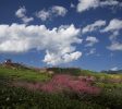 以巨大的綠茶農田為背景,花朵顯得更加明亮,就像一條巨大的粉紅色緞帶在山上蜿蜒曲折。