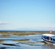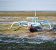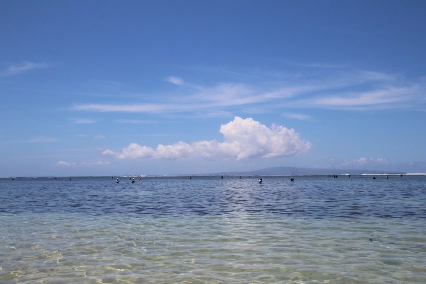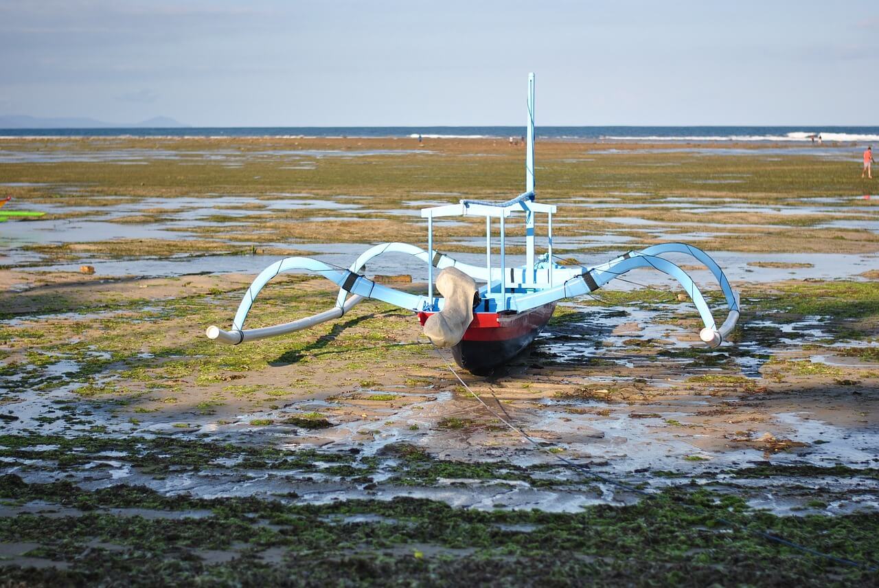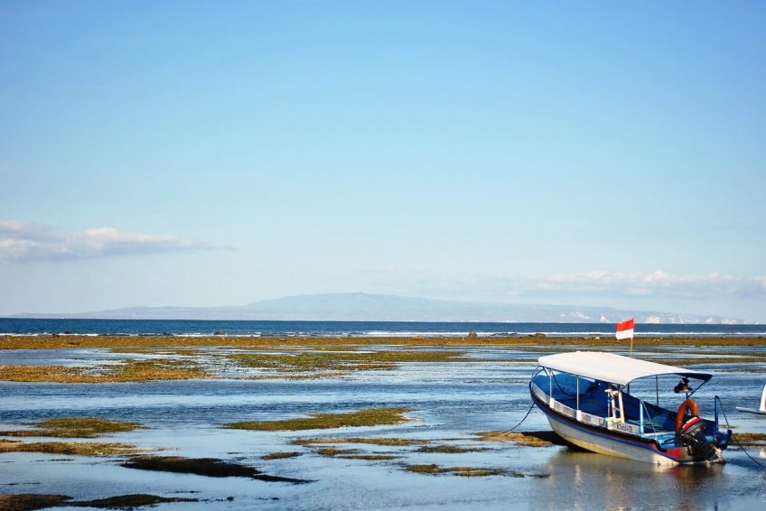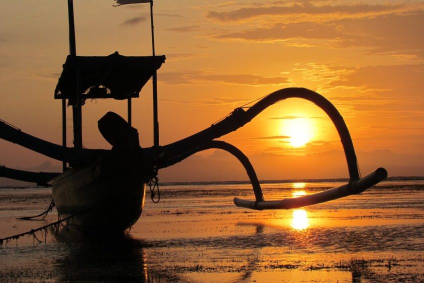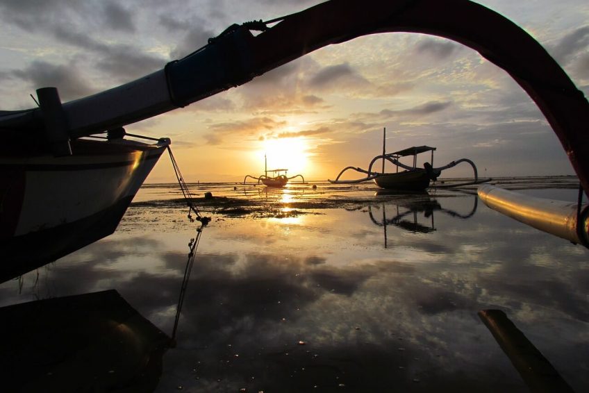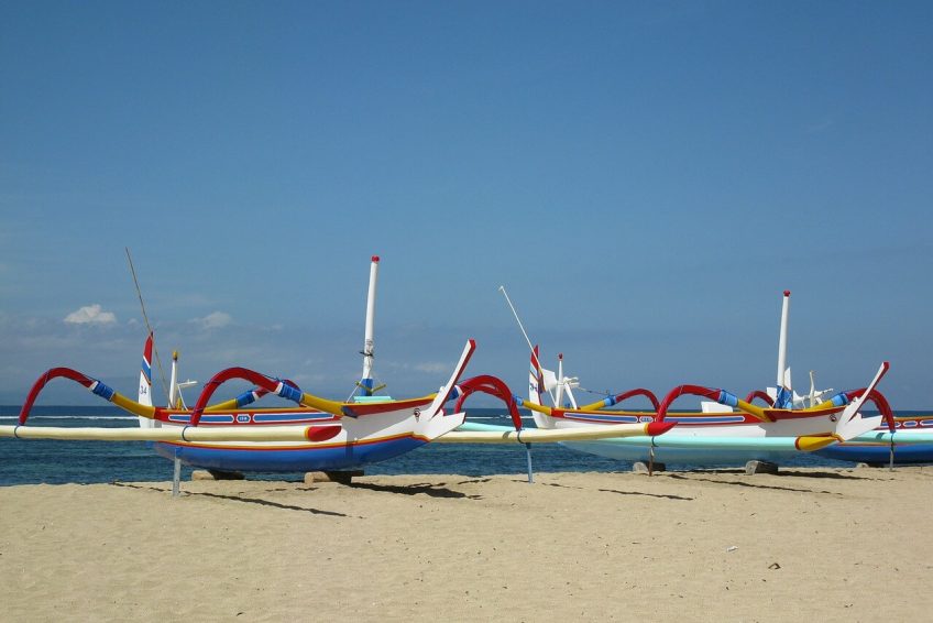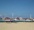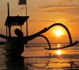 在Sanur的海灘上可以看到傳統的漁船,提供了Nusa Penida島的風景。