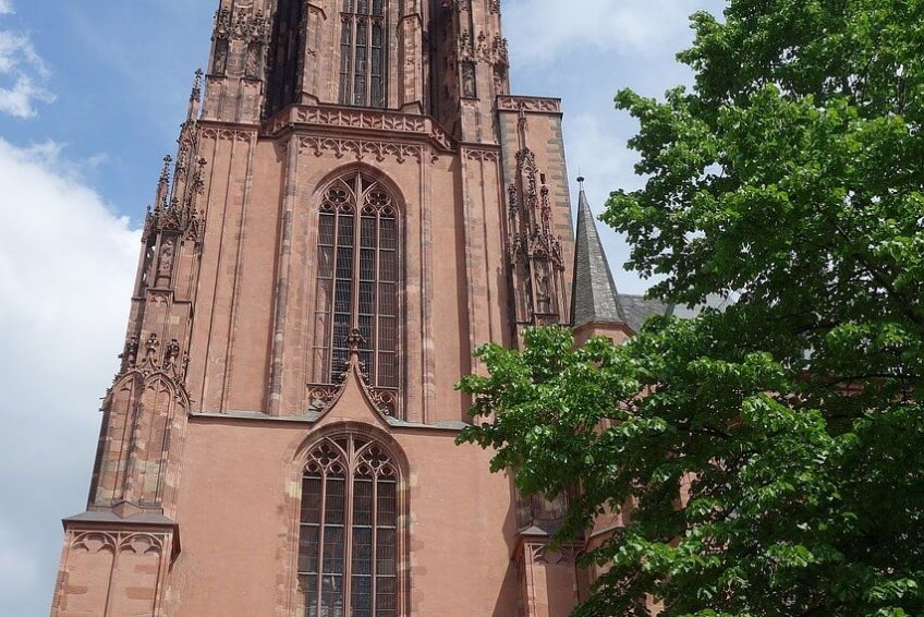 法兰克福大教堂是一个帝国学院教堂,在德语中被称为Dom——所有学院教堂的提喻法,用totum pro parte也用于大教堂——因此传统上翻译成英语大教堂。圣巴塞洛缪教堂是法兰克福的主要教堂,建于14世纪和15世纪,是在墨洛温王朝早期教堂的基础上建造的。