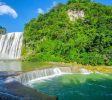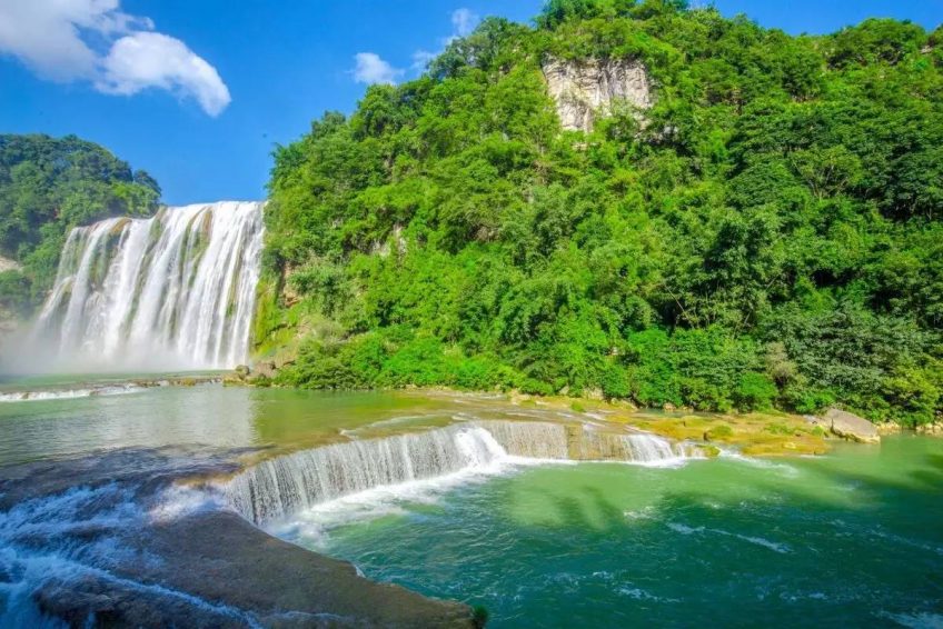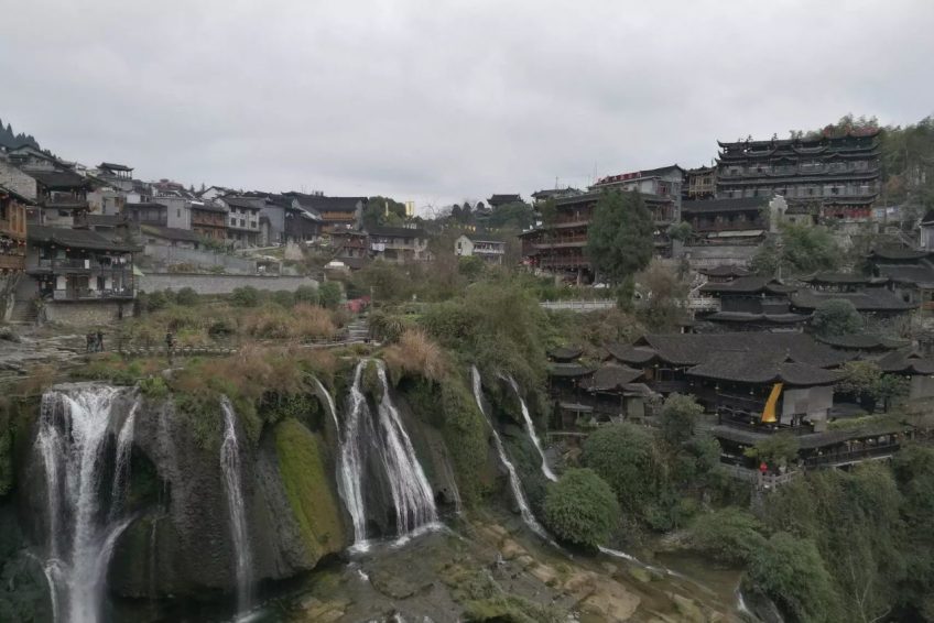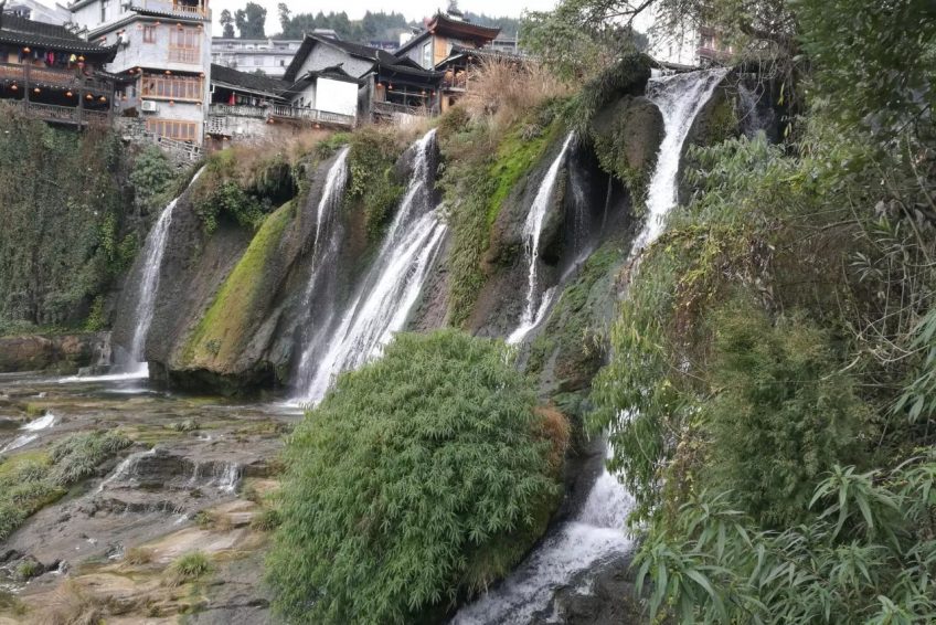 從德夯苗寨順著九龍溪步行不遠,便可見到流沙瀑布。溪水從絕壁之上騰空而下,極高的落差,流水到了下面就散落成流沙狀,因此瀑布被稱為流沙瀑布。豐水期,滾滾流水從懸崖上飛落入深潭,猶如九龍翻波,氣勢磅礴;枯水期,流水飄下懸崖,時而如輕紗拂面,時而似珠簾懸掛,宛如白紗蕩滌綠潭,溫柔秀雅。