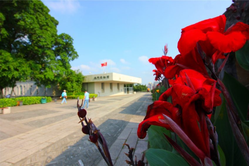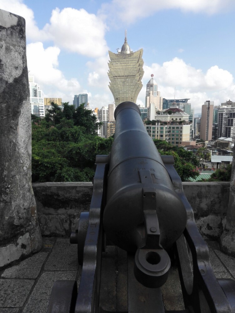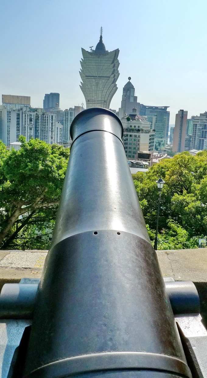 如今,大炮台前有很大一片绿地,古木参天,绿树成荫,可以在这里俯瞰澳门,仿佛就像一座大沙盘展示在眼前。在这里可以看到澳门半岛标志性建筑,外观造型如同一朵绽放莲花的新葡京娱乐场,是合影留念的好角度。