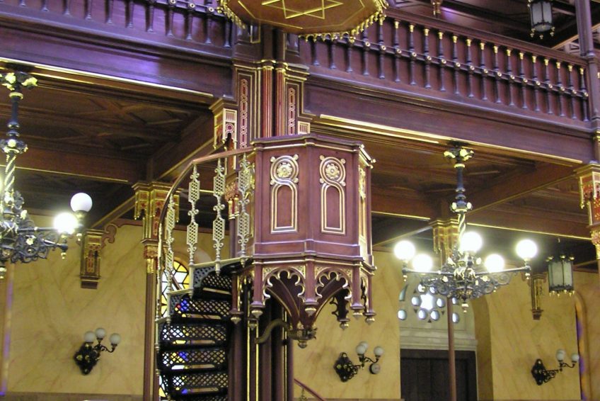 在多哈尼猶太教堂頂部的時鐘不起作用。洋蔥形狀的穹頂與多哈尼猶太教堂的鍍金飾品是它看起來像東方摩爾人的主要原因。建造。作為第一個以這種風格製作的猶太教堂,它非常成功,以後在世界各地建造的猶太教堂經常以同樣的風格設計。這是一張屋頂照片,取自猶太教堂對面的公寓樓。在猶太教堂之上,我們可以看到帶有指令的石碑。
