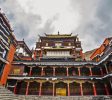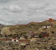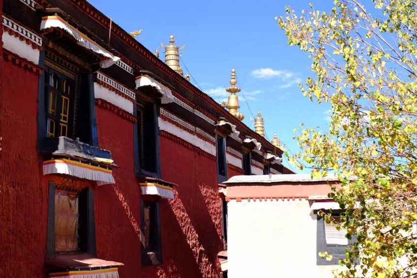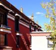 沿着甬道走进去,迎面既是寺庙的措钦大殿,殿内供奉三世佛,东西两侧为净土殿。殿堂西北角有一座巨大的强巴佛鎏金铜像,高8米,据说是用14000公斤黄铜铸成的。大殿的立柱上挂满五彩的哈达和历史悠久的唐卡,四壁绘有精美的佛教壁画,感觉庄严而神圣。大殿分三层,第三层是称为夏耶拉康的佛殿,殿内的壁画颇有名气,内容有坛城、莲花藻井和佛传故事、本生故事等,有兴趣的话可以认真看看。
