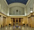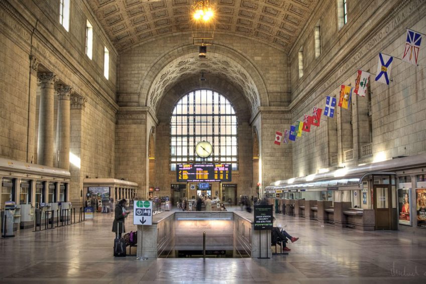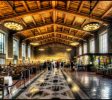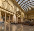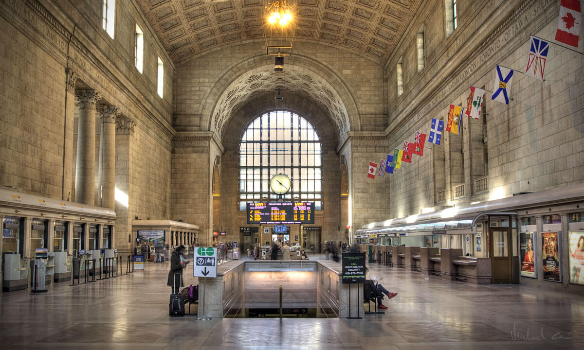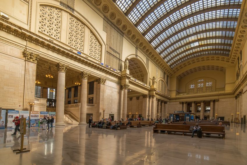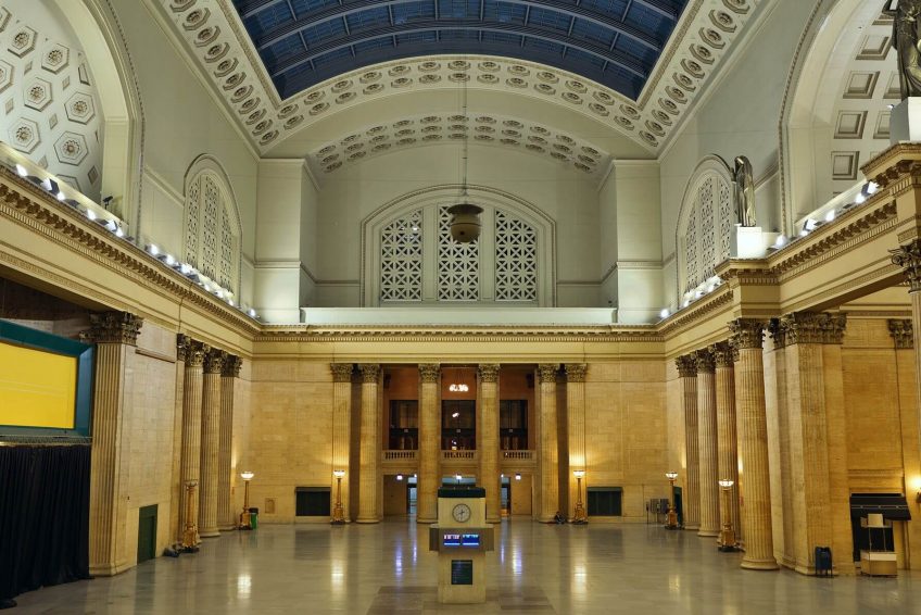 伯纳姆还参考了1837年伦敦尤斯顿车站的雄伟拱门,将通往终点站的入口设计成凯旋门的形式,也将庞大的终点大厅以围绕凉廊的长拱廊通道连接起来,长拱廊道上有数个排成长列的隔间,用防火瓷砖盖成拱状。联合车站的正面坐落于数条大道汇集点的一个类似公园的环境空间,这样的设计是1890年代及1900年代城市美化运动的几项成就之一。