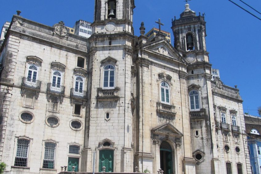 现在的寺庙建筑始于1736年,具有很大的建筑价值。该项目归功于Manuel Cardoso de Saldanha。如Prospecto de Caldas所示,该建筑在1758年已经很先进,仍然没有塔楼。新教堂于1765年落成,不完整。1801年,维尔纳 表明其中一座塔已经存在。1810年的另一个例子表明,两座塔楼已经存在。新庙被认为是在1820年完成了1832年,奥古斯塔斯·厄尔,谁与达尔文的探险队到达时,做出了最美丽的19之一 – 萨尔瓦多世纪的插图,如果您看到这个教堂雄伟的塔楼。