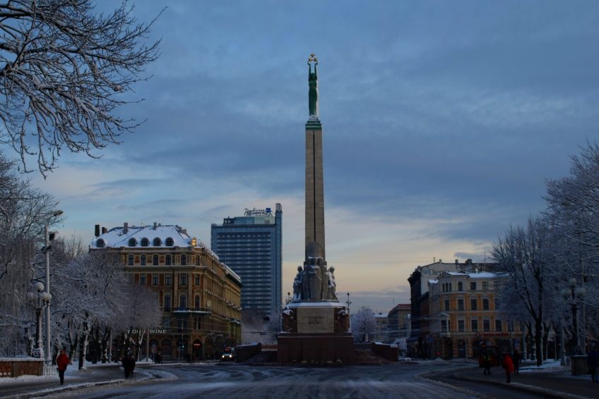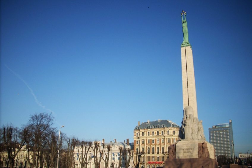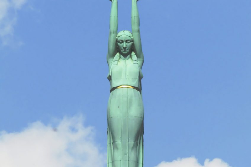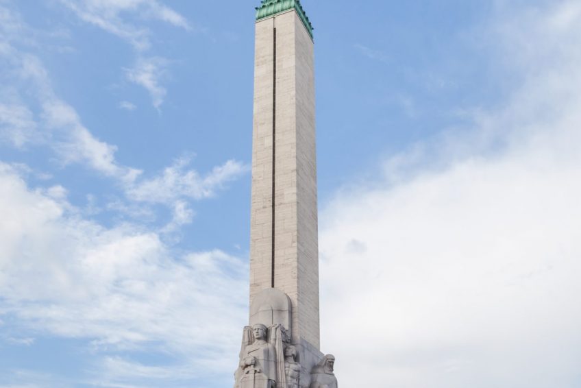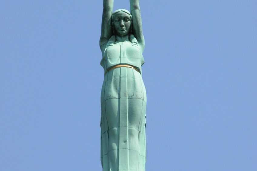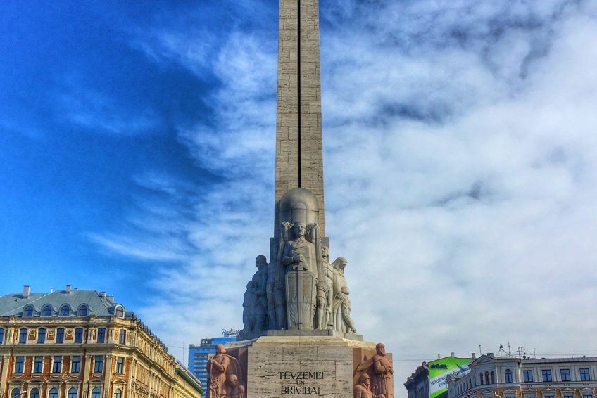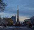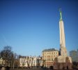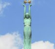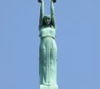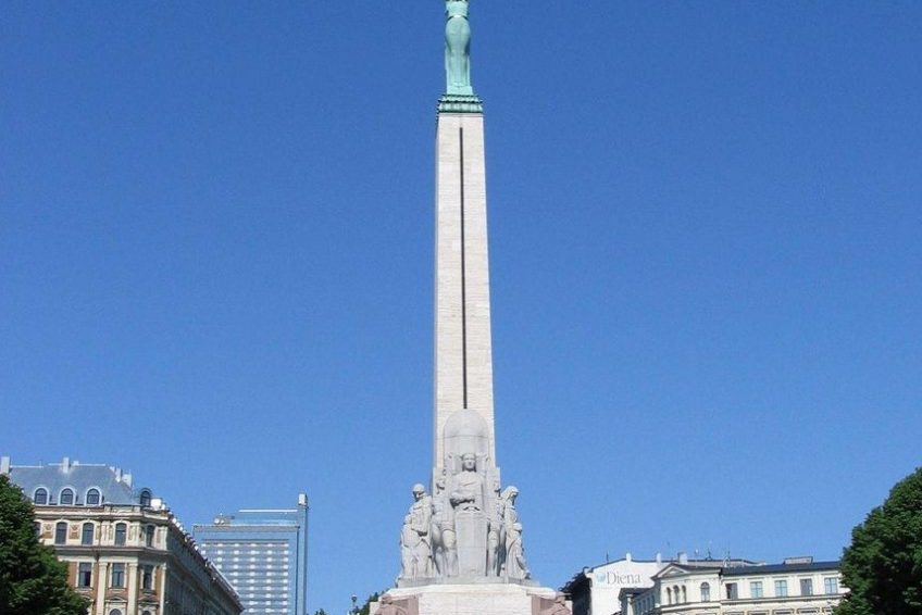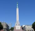 自由纪念碑的雕塑和浅浮雕排列在十三个小组中,描绘了拉脱维亚文化和历史。纪念碑的核心由四边形形状组成,彼此重叠,朝向顶部逐渐减小。一个十米高的红色花岗岩楼梯,高1.8米(5.9英尺),在两座石灰华浮雕高度为1.7米(5.6英尺),宽4.5米(15英尺)的纪念碑底部蜿蜒,“拉脱维亚步枪兵”(13 ;拉脱维亚语:Latvjustrēlnieki)和“拉脱维亚人:歌手”(14;拉脱维亚语:Latvju tauta – dziedātāja),装饰其3米(9.8英尺)厚的侧面。另外两个台阶形成一个直径28米(92英尺)的圆形平台,整个纪念碑就在其上。在纪念碑的前面,这个平台形成一个矩形,用于礼仪建议。纪念碑的底座也是由红色花岗岩制成,由两个矩形块组成:下层是一块3.5米(11英尺)高,9.2米(30英尺)宽,11米(36英尺)长的整体式建筑。较小的上部高3.5米(11英尺),宽8.5米(28英尺),长10米(33英尺),角落有圆形壁龛,每个壁龛包含一个由三个人物组成的雕塑组。它的两面也镶有石灰华。
