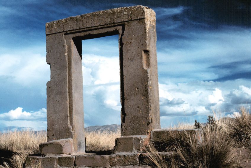 “太陽之門”,蒂瓦納庫,由Ephraim Squier於1877年繪製。在這幅畫中誇大了比例。