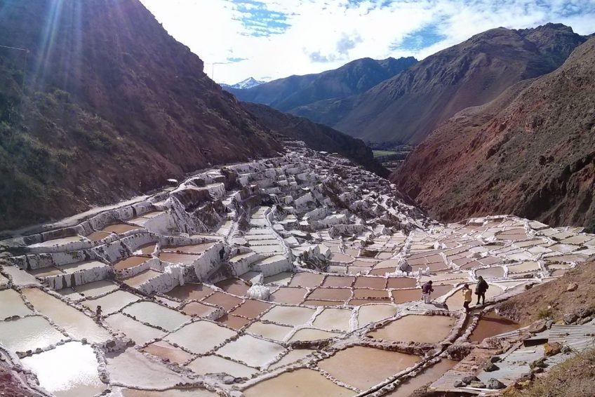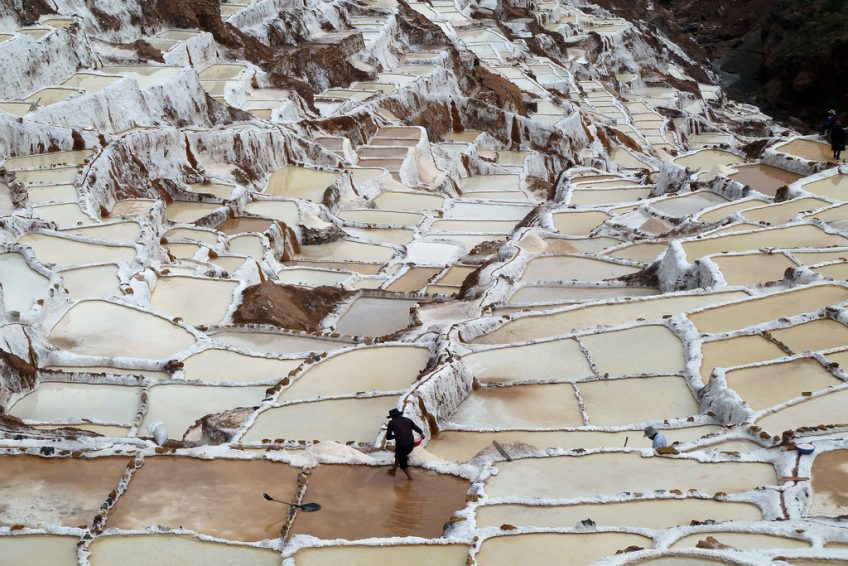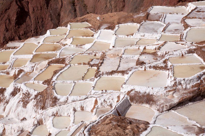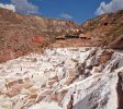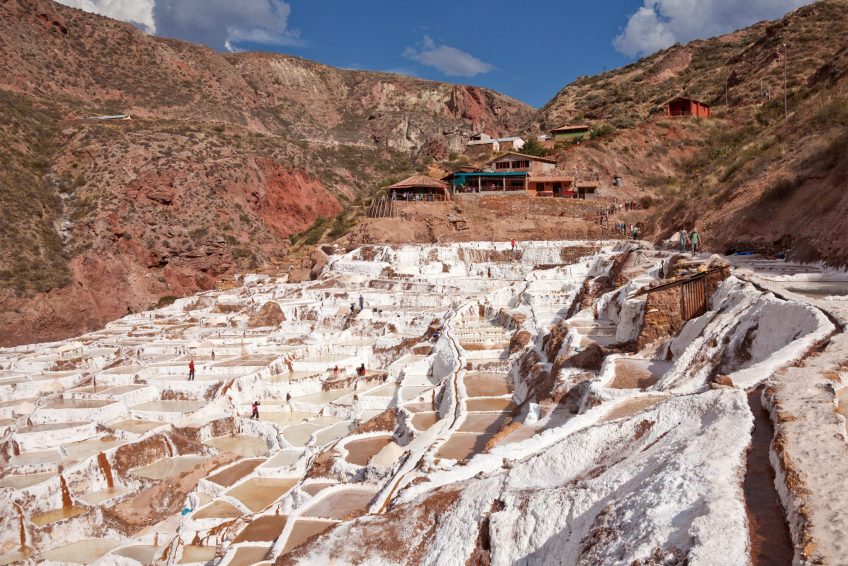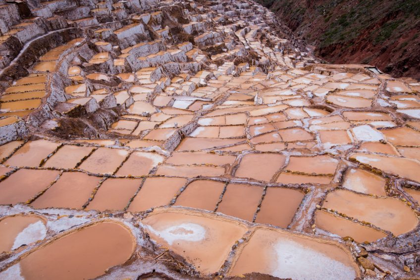 Salinas de Maras位於Qaqawiñay山的山坡上,位於Urumbamba山谷海拔3,380米處,距離秘魯庫斯科46公里。這個鹽礦是一個由近3000個鹽田組成的複雜網絡,淺水池由一個超鹹水地下泉水填充。據信,這些鹽田是在印加時代之前(公元1430年之前)開發的,今天是當地家庭在5月至11月旱季期間手工採摘的。天然的粉紅色鹽從泉水中的微量元素中獲取其美麗的色調,包括鈣,鎂,矽和鉀。