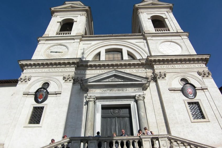 竞争在1717年之后的步骤是设计的鲜为人知的弗朗西斯科·德桑蒂斯,尽管Alessandro Specchi长期被认为产生获胜的条目。一代又一代的热烈讨论如何陡坡教堂的肩膀Pincio应该城市化之前最后的执行。档案图纸从1580年代显示,教皇格里高利十三世构造一个楼梯很感兴趣最近完成了外观的法国教堂。加斯帕·Wittel的看法1683年树木繁茂的山坡,Scalinata建成之前,守恒在国家队广场,罗马。 Roman-educated红衣主教Mazarin把个人兴趣Gueffier的规定的项目,将在罗马,并委托其代理人的计划包括了路易十四的马术纪念碑,一个雄心勃勃的入侵创造了一个轰动的罗马教皇。 Mazarin死于1661年,1667年,教皇和Gueffier将成功竞争的一个侄子声称一半;所以项目奠定休眠直到教皇克莱门特习近平Albani兴趣重燃。波旁fleur-de-lys和无辜的十三鹰和皇冠小心地平衡在雕塑细节。解决方案是一个巨大的通货膨胀的楼梯平台园的一些约定。西班牙台阶,约瑟夫·德·拉兰得和查尔斯·德·布罗斯已经在贫穷的条件,指出已经恢复几次,最近一次是在1995年。新装修开始于10月8日,2015年和2016年9月21日重新开放的步骤