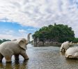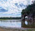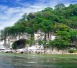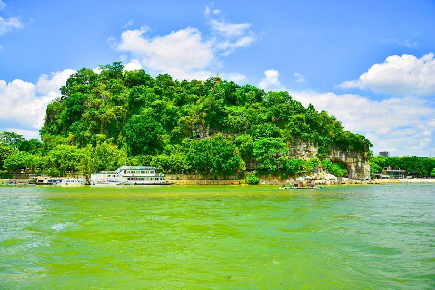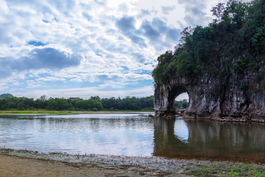 象鼻山形狀好像一隻飲水的大象,鼻子伸進水中。象鼻山上有一座塔,名曰普賢塔,東邊有一山洞,曰水月洞,洞中有水流過。