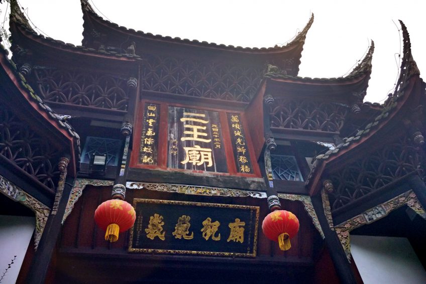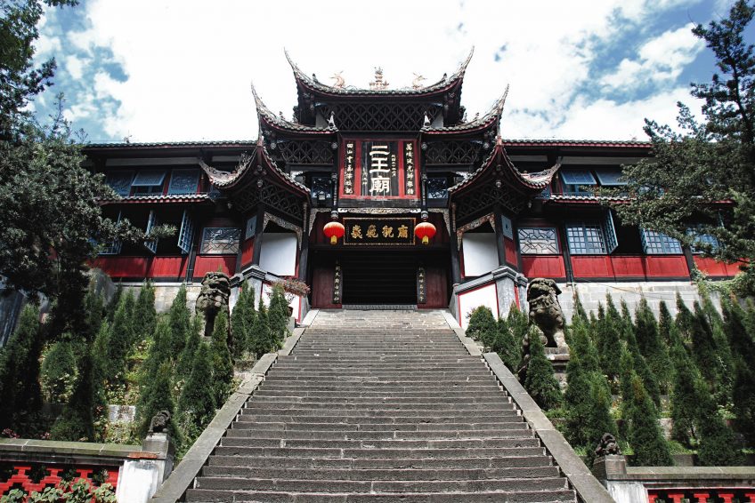 二王廟位於岷江右岸的山上。它是為紀念李冰和他的兒子而建造的。寺廟保留了清朝的建築風格(1644-1911)這裡整個環境相當寧靜和美麗。在寺廟的石牆上刻有許多描繪水控經驗的漢字。在大禮堂,你可以看到李和他兒子的生動雕像,他們每天都受到當地人的崇拜。香火從未停止在寺廟中燃燒。二百二十多年來,人們為李和他的兒子舉行了紀念儀式。今天的主要活動是6月24日至6月26日在中國農曆日舉行的廟會和清明節的清水節。