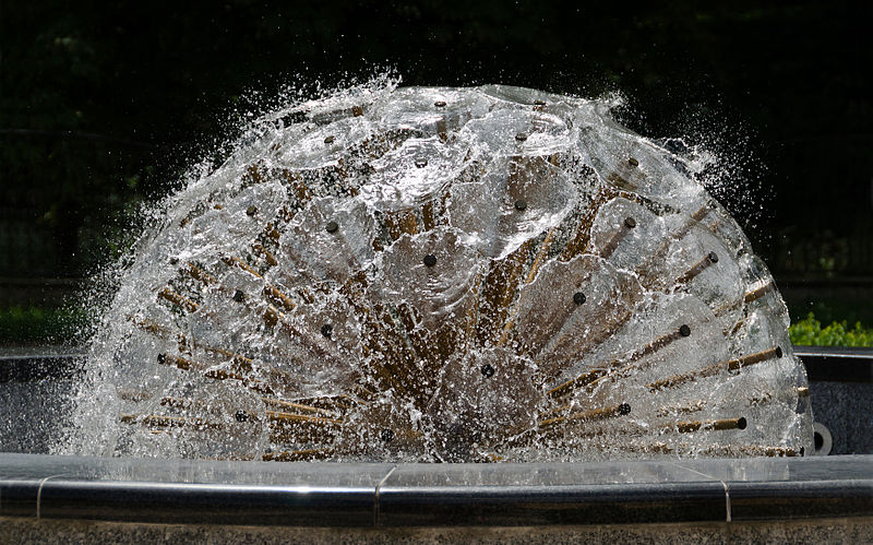 噴泉擁有極好的現代主義設計,在一系列四個梯田池中喚起巨大的蒲公英水。球形青銅噴泉頭包括211個徑向排列的“莖”,總直徑為12英尺6英寸(3.81米)。從周邊,水從形成球體的碟形薄膜中的數百個出口擠出。水盤融合在一起,營造出一種巨大的蒲公英或蒲公英的印象。