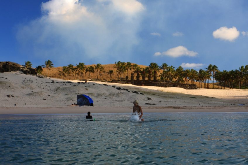 Anakena仍然是一個未受污染的海灘,游泳者很少,特別是在早上(有組織的旅行通常在下午到達)或淡季,這有時可以讓這個小而遙遠的美麗天堂獨自享受。