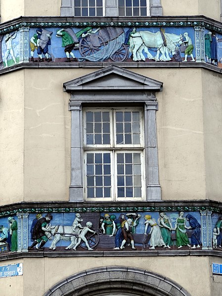Sunlight Chambers有很多事情要做。位于议会大街和埃塞克斯码头的拐角处,这是一个色彩缤纷的地标,由Edward Ould设计,于1899年至1901年间为Lever Bros建造.20世纪90年代后期,Gilroy McMahon在保护工作期间,该建筑得到了恢复和照亮。来自NCAD的咨询。虽然赤陶瓷砖,深檐或拱廊可能引起人们对另一栋建筑的注意,但它们却被这些带状物推到了这里。