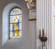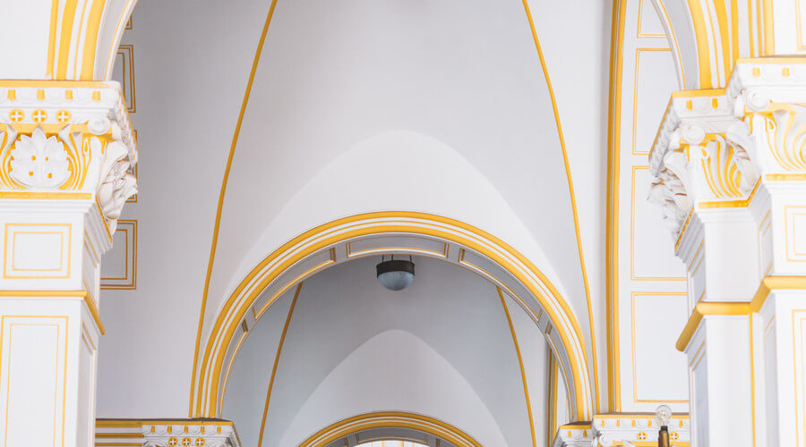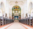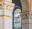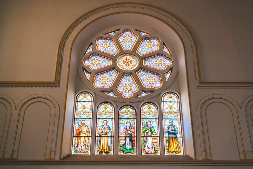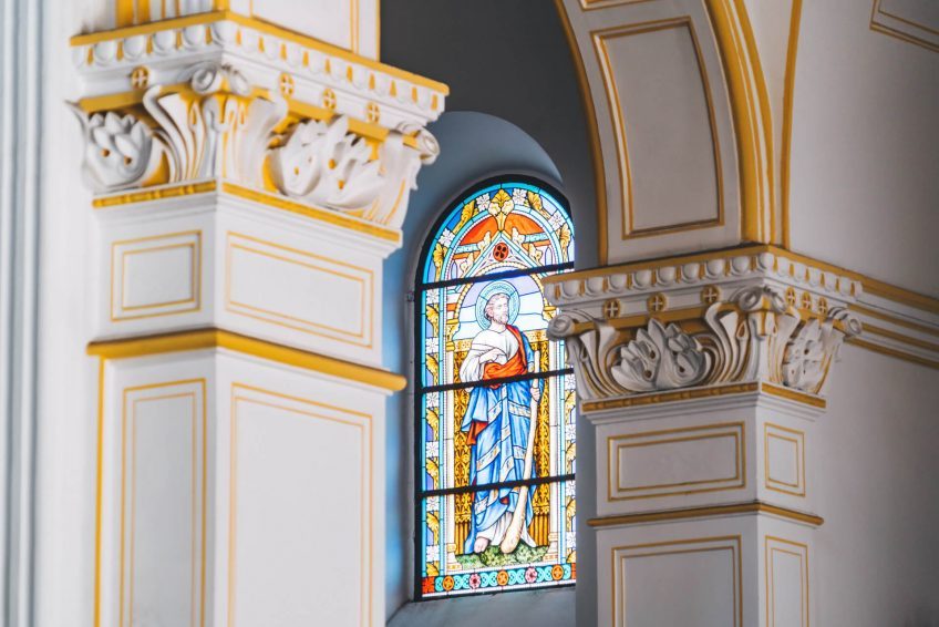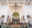 教堂主要采用黄色花岗岩和钢筋混凝土建造,表面雕刻有简洁美观的纹理。窗户呈半圆形拱形,线条流畅,简约而庄重。门上方设有一扇巨大的玫瑰窗。每侧都有一座高度为56米的钟楼。它们的每个圆锥形尖塔都覆盖着红色瓷砖,并有一个4.5米高的巨大十字架。塔的侧面有四个大钟。当铃声响起时,声音可以达到几英里之外。走进教堂,你会看到一个宽敞明亮的大厅,高18米,可容纳数千人。彩色玻璃窗反射柔和的灯光。大厅东侧和西侧有一条走廊。大厅后面有两座大祭坛和四座小祭坛。