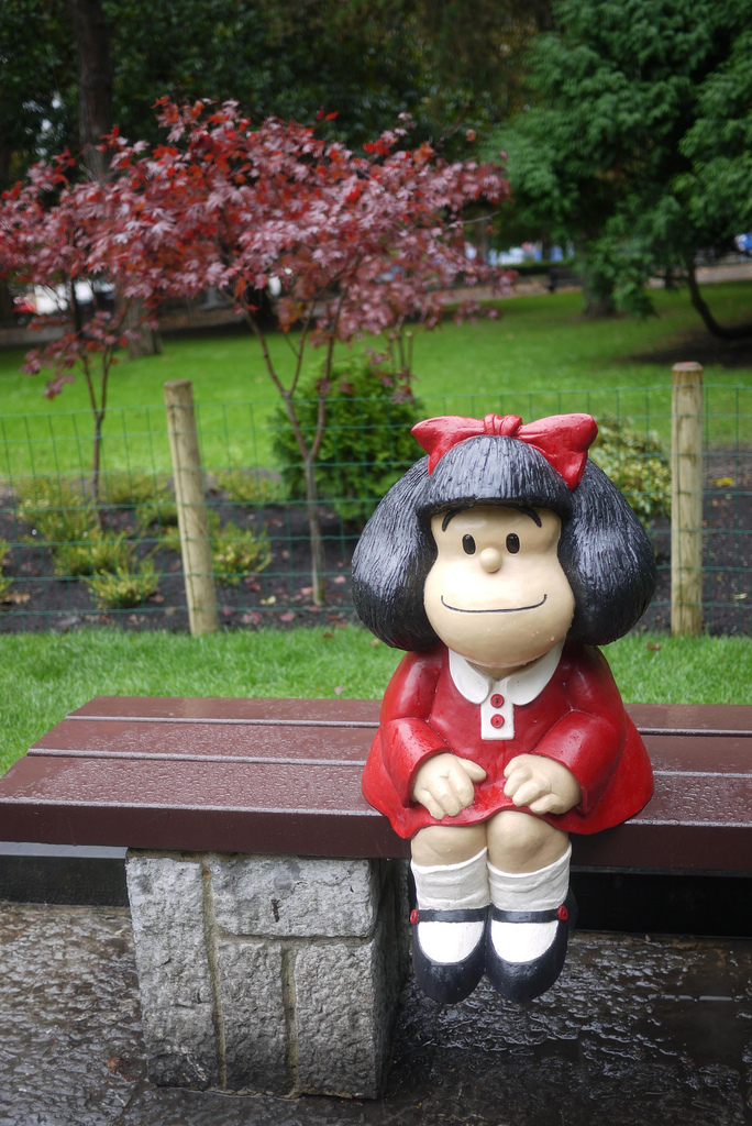 她的雕像位于Quino过去居住的角落,智利和Defensa之间,圣特尔莫附近。这是与人物过去坐在前面的连环画一样的建筑,同时考虑并发布他们对周围世界的敏锐观察.Mafalda的雕像只有80厘米高(31英寸),它的特点是她微笑着坐在公园的长椅上。