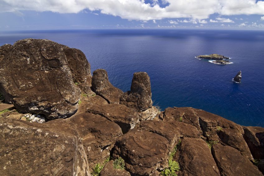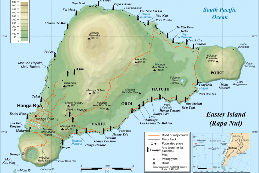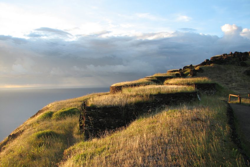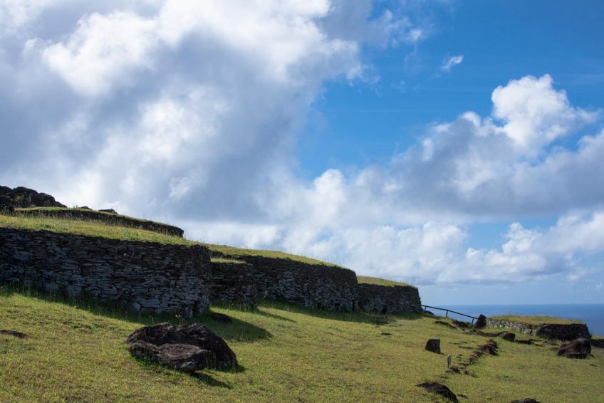 復活節島是智利的一個特殊領土,於1888年被吞併,最為著名的是遍布其海岸線的數百個摩艾雕像。整個島嶼位於東南太平洋,在拉帕努伊國家公園的世界遺產保護區內。位於公園南部的Orongo儀式村被認為是世界上最壯觀的考古遺址之一。它坐落在一個狹窄的山脊上,一側是Rano Kau火山的火山口,另一側是海拔300米的懸崖。 Orongo包含許多岩畫和石頭房子,其歷史可以追溯到復活節島歷史上的Huri-Moai時期(約1680-1867)。獨立的干鋪房屋以草皮屋頂為特色,內置於場地的地形中。 Orongo的Mata Ngarau禮儀中心,Tangata Manu(鳥人)崇拜的中心,繼承了moai文化,是年度比賽的場地,代表了競爭部落之間的權力轉移。到十九世紀末,大部分拉帕努伊文化已經滅亡或皈依了基督教; Tangata Manu邪教組織倒塌,Orongo被遺棄。