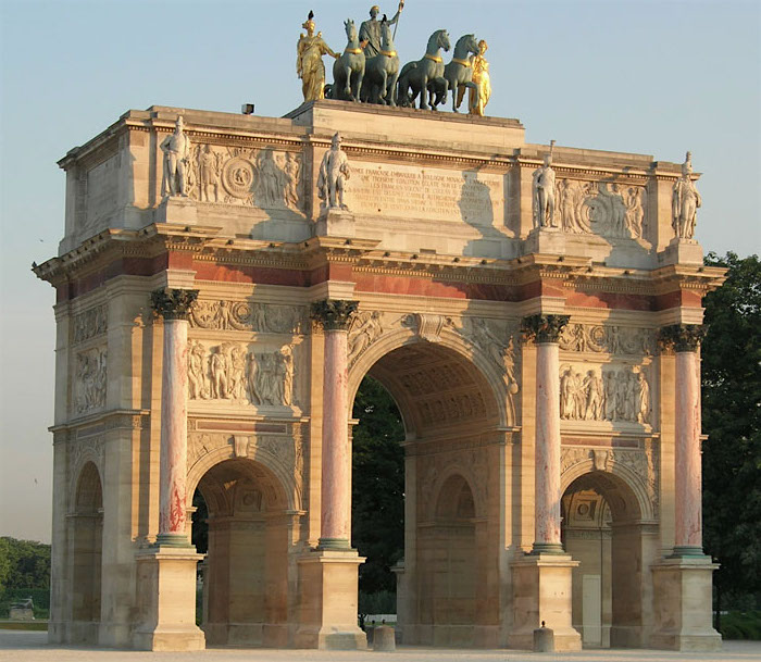 根据古代古董的传统,1806年至1808年,1806年至1805年,卡鲁塞尔的凯旋门在1806年至1808年期间被佩西尔和喷泉建造。幸运的是,在1871年摧毁了Tuilaries宫殿时,卡鲁塞尔的弓保持着和谐的和谐。相反,它从一个独特的角度出发,朝着香榭丽舍大道和星星的凯旋门打开了一个独特的前景。