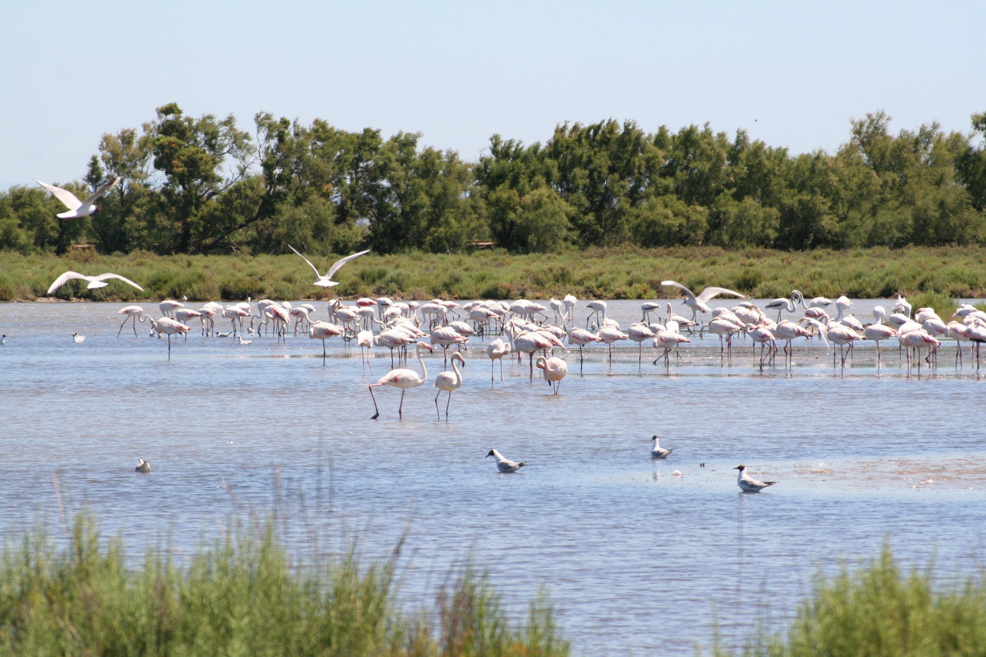 Camargue 自然公園區域包括一個聯合國教科文組織指定的大型生物圈保護區,可以在一年中的任何時間參觀,但最好的時間是在春季和秋季當公園的濕地成為成千上萬隻候鳥的主要集結點時。特別是在今年的這個時候,卡馬格吸引了來自歐洲各地的鳥類觀察者。但遊客全年來到該地區欣賞其野生動物,特別是成千上萬的粉紅色火烈鳥。這些可以在公園的許多淺水區欣賞,但最容易在Camargue鳥類公園,一個位於Saintes Marie de la Mer以北的鳥類公園。該中心擁有數公里的小徑,是許多種水禽的家園,包括火烈鳥,白鷺和蒼鷺; 它還有一家鳥類醫院。